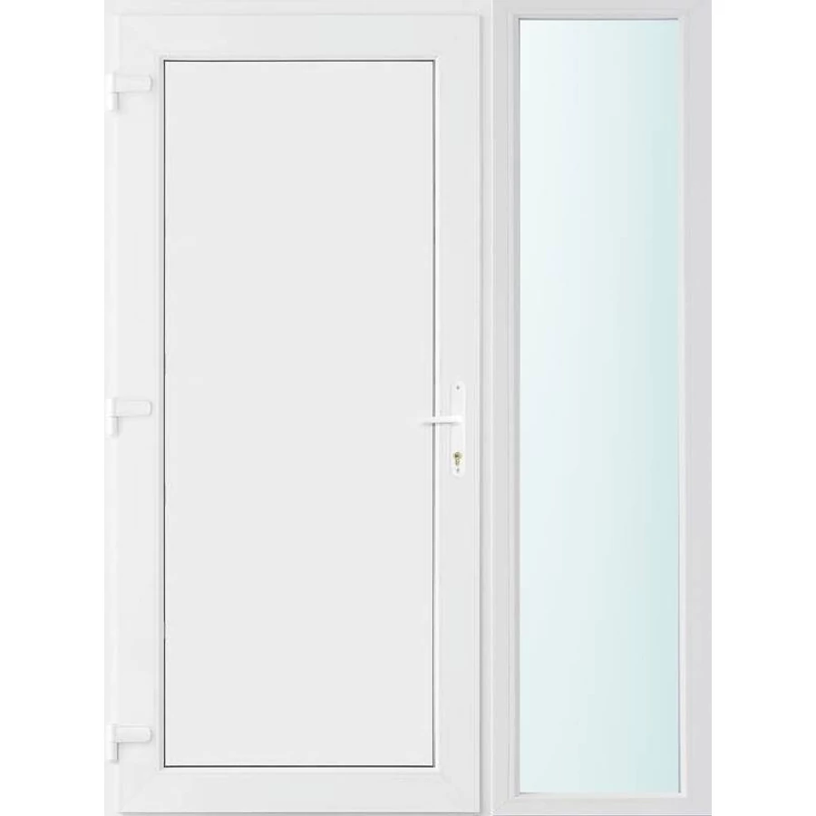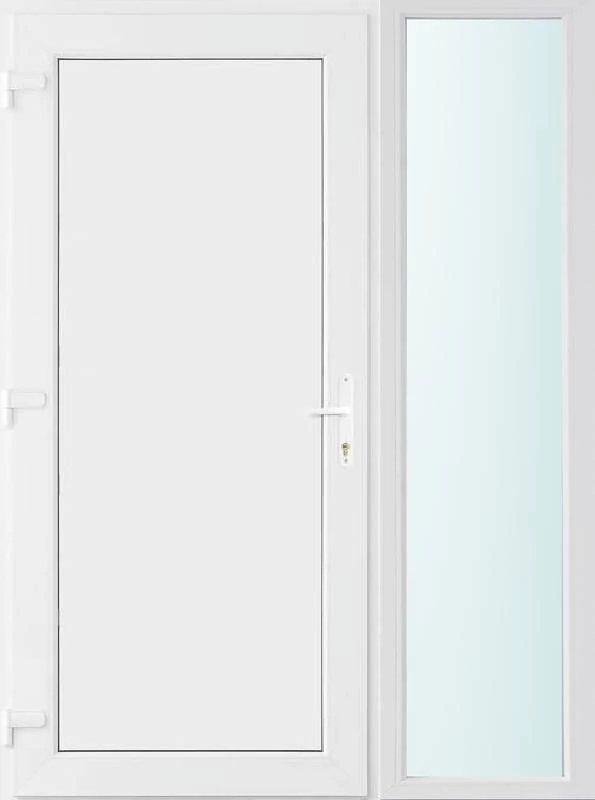 Kiváló hőszigetelésű műanyag bejárati ajtó 5 kamrás profilból, 70 mm beépítési mélységgel, tokban körbefutó idomacél merevítéssel. Vasalat: kilincsműködtetésű, VORNE 5 pontos ajtózárral, 3 db 3D erősített ajtópánttal, 20mm magas hőhídmentes alumínium küszöbbel. Dupla szürke ütközőtömítéssel rendelkezik. Üvegezése "SAVMART" katedrál 2 rétegű Szuperlágybevonatos thermo üveg, 24 mm vastagságban, UG értéke: 1.0 W/m2K . A bejárati ajtó mindkét oldalán fehér színű. Nyitásmódja befelé nyíló, nyitásiránya balos ( bentről nézve a zsanér a bal oldalon helyezkedik el ). Tényleges tokkülmérete: 138 cm széles 208 cm magas. 98 cm széles 208 cm magas bejárati ajtóból, 40 cm széles 208 cm magas fix "SAVMART" üvegezésű ( nem nyitható) oldalvilágítóból áll. ( két külön elem ami beépítéskor összeszerelendő). A nyílászáró ára nem tartalmazza a KILINCSET és a ZÁRBETÉTET a beszereléshez szükséges segédanyagokat (falkampó, csavar, pur-hab..stb.), külső-belső takaróléceket.