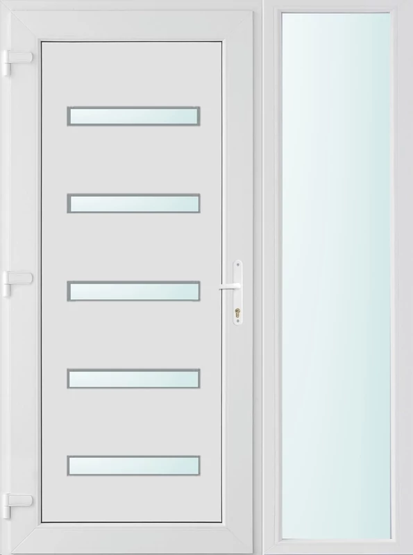 Kiváló hőszigetelésű műanyag bejárati ajtó 5 kamrás profilból, 70 mm beépítési mélységgel, tokban körbefutó idomacél merevítéssel. Vasalat: kilincsműködtetésű, VORNE 5 pontos ajtózárral, 3 db 3D erősített ajtópánttal, 20mm magas hőhídmentes alumínium küszöbbel. Dupla szürke ütközőtömítéssel rendelkezik. Üvegezése "SAVMART" katedrál 2 rétegű Szuperlágybevonatos thermo üveg, 24 mm vastagságban, UG értéke: 1.0 W/m2K . A bejárati ajtó mindkét oldalán fehér színű. Nyitásmódja befelé nyíló, nyitásiránya balos ( bentről nézve a zsanér a bal oldalon helyezkedik el ). Tényleges tokkülmérete: 138 cm széles 208 cm magas. 98 cm széles 208 cm magas bejárati ajtóból, 40 cm széles 208 cm magas fix "SAVMART" üvegezésű ( nem nyitható) oldalvilágítóból áll. ( két külön elem ami beépítéskor összeszerelendő). A nyílászáró ára nem tartalmazza a KILINCSET és a ZÁRBETÉTET a beszereléshez szükséges segédanyagokat (falkampó, csavar, pur-hab..stb.), külső-belső takaróléceket.