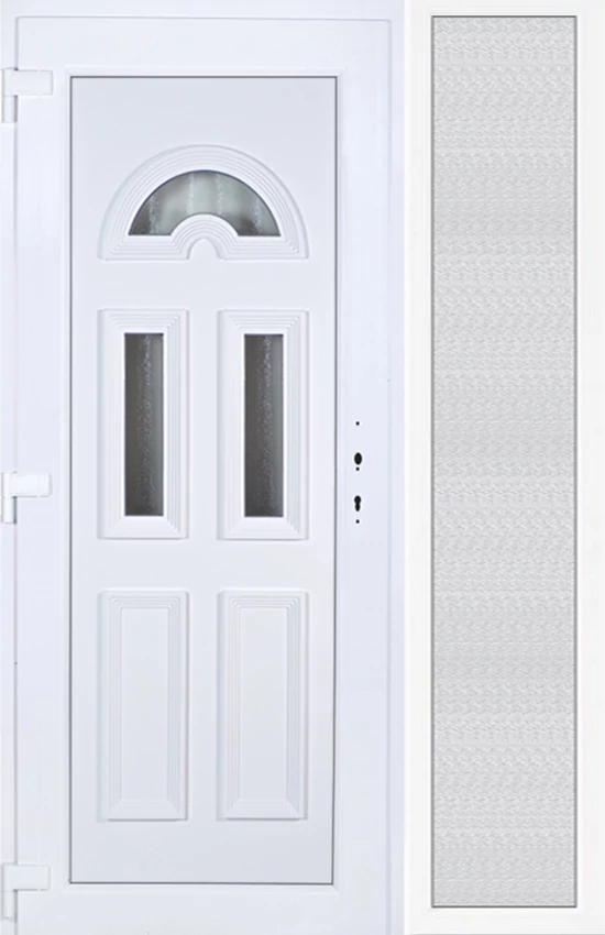 EXTRA hőszigetelésű műanyag bejárati ajtó 5 kamrás profilból, 70 mm beépítési mélységgel, tokban körbefutó idomacél merevítéssel. Vasalat: kilincsműködtetésű, 5 pontos ajtózárral, 3 db 3D erősített ajtópánttal, 20mm magas hőhídmentes alumínium küszöbbel, + 20mm purenittel a küszöb alatt. Dupla szürke ütközőtömítéssel rendelkezik. Üvegezése "savmart" katedrál 3 RÉTEGŰ Szuperlágybevonatos thermo üveg, 42 mm vastagságban, UG értéke: 0,7 W/m2K . A bejárati ajtó mindkét oldalán fehér színű. Nyitásmódja befelé nyíló, nyitásiránya balos ( bentről nézve a zsanér a bal oldalon helyezkedik el ). Tényleges tokkülmérete: 138 cm széles 209 cm magas. 98 cm széles 209 cm magas bejárati ajtóból, 40 cm széles 209 cm magas fix "savmart" üvegezésű ( nem nyitható) oldalvilágítóból áll. ( két külön elem ami beépítéskor összeszerelendő). A nyílászáró ára nem tartalmazza a KILINCSET és a ZÁRBETÉTET a beszereléshez szükséges segédanyagokat (falkampó, csavar, pur-hab..stb.), külső-belső takaróléceket.
