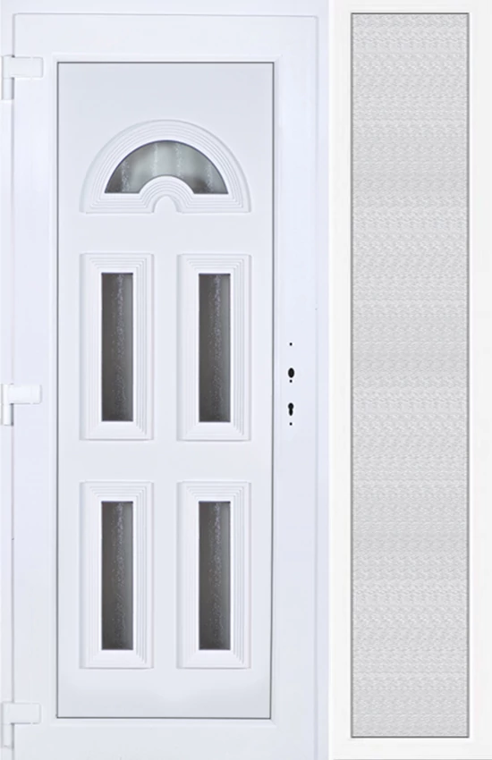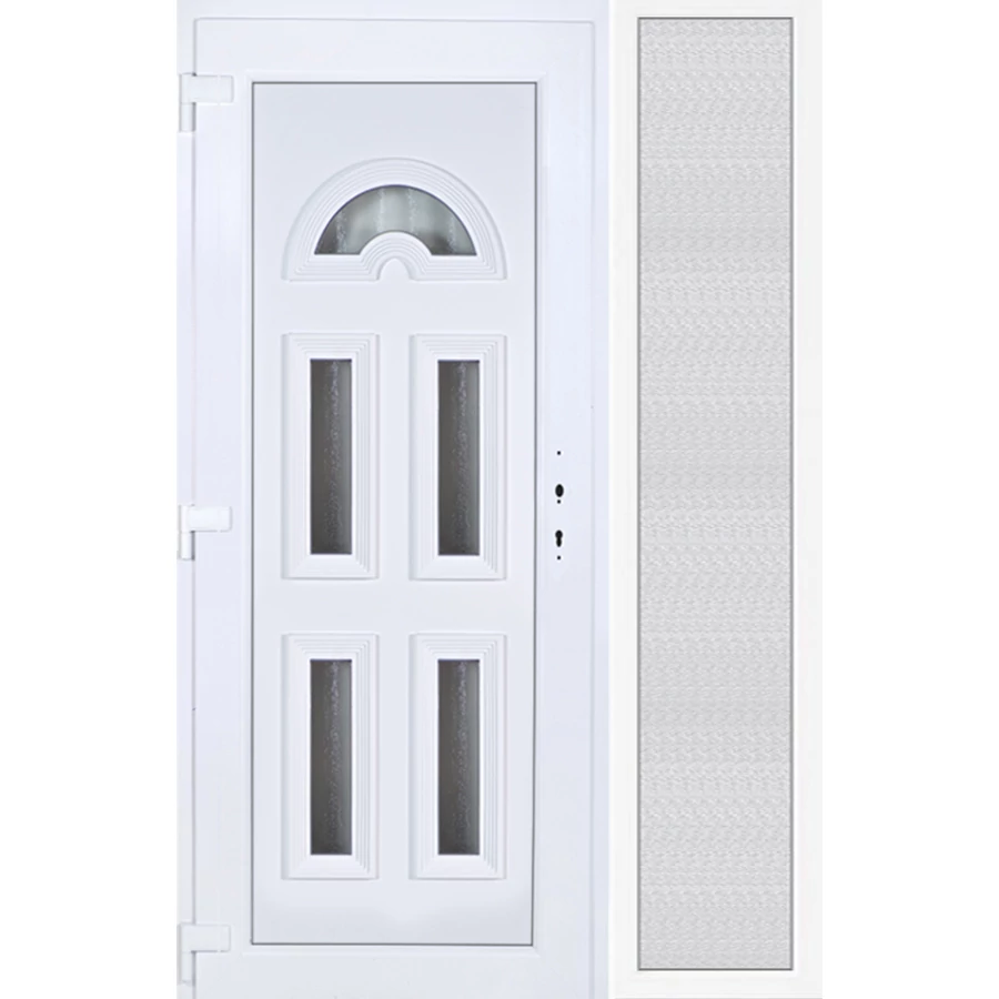 EXTRA hőszigetelésű műanyag bejárati ajtó 5 kamrás profilból, 70 mm beépítési mélységgel, tokban körbefutó idomacél merevítéssel. Vasalat: kilincsműködtetésű, 5 pontos ajtózárral, 3 db 3D erősített ajtópánttal, 20mm magas hőhídmentes alumínium küszöbbel, + 20mm purenittel a küszöb alatt. Dupla szürke ütközőtömítéssel rendelkezik. Üvegezése "savmart" katedrál 3 RÉTEGŰ Szuperlágybevonatos thermo üveg, 42 mm vastagságban, UG értéke: 0,7 W/m2K . A bejárati ajtó mindkét oldalán fehér színű. Nyitásmódja befelé nyíló, nyitásiránya balos ( bentről nézve a zsanér a bal oldalon helyezkedik el ). Tényleges tokkülmérete: 138 cm széles 209 cm magas. 98 cm széles 209 cm magas bejárati ajtóból, 40 cm széles 209 cm magas fix "savmart" üvegezésű ( nem nyitható) oldalvilágítóból áll. ( két külön elem ami beépítéskor összeszerelendő). A nyílászáró ára nem tartalmazza a KILINCSET és a ZÁRBETÉTET a beszereléshez szükséges segédanyagokat (falkampó, csavar, pur-hab..stb.), külső-belső takaróléceket.