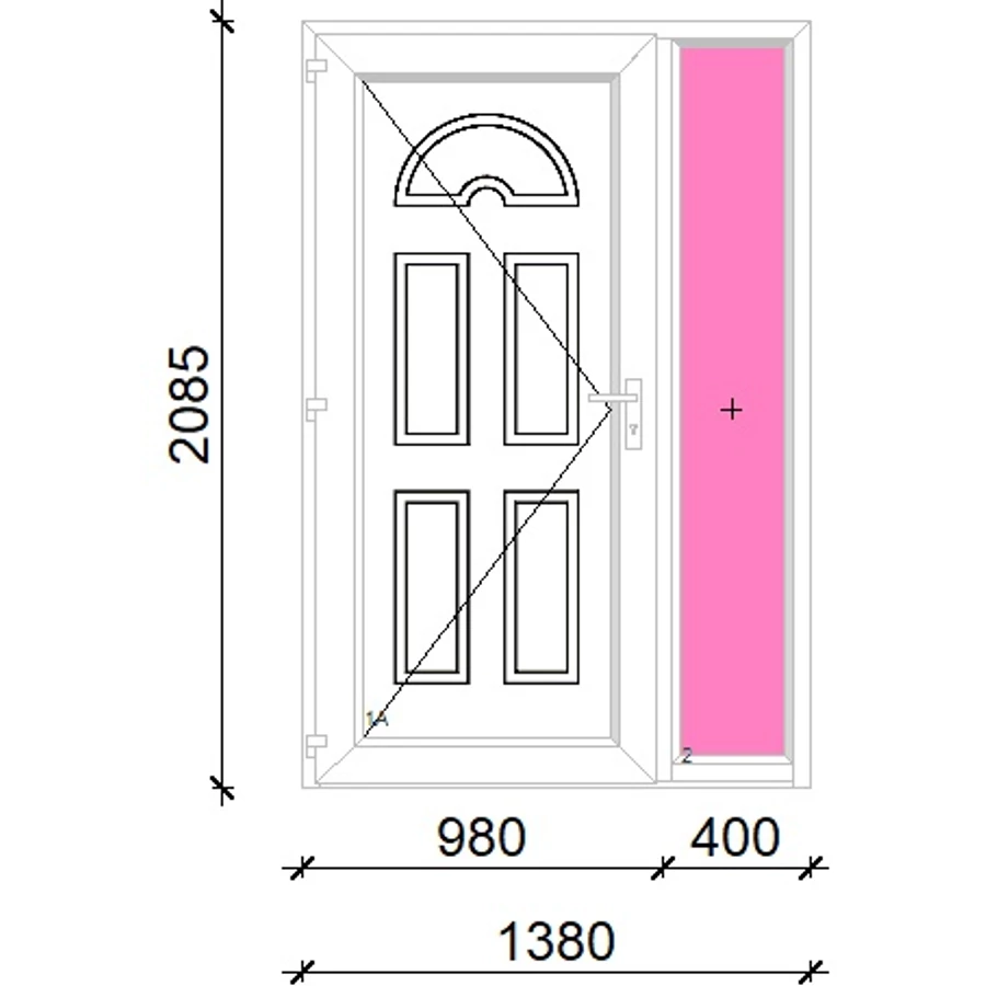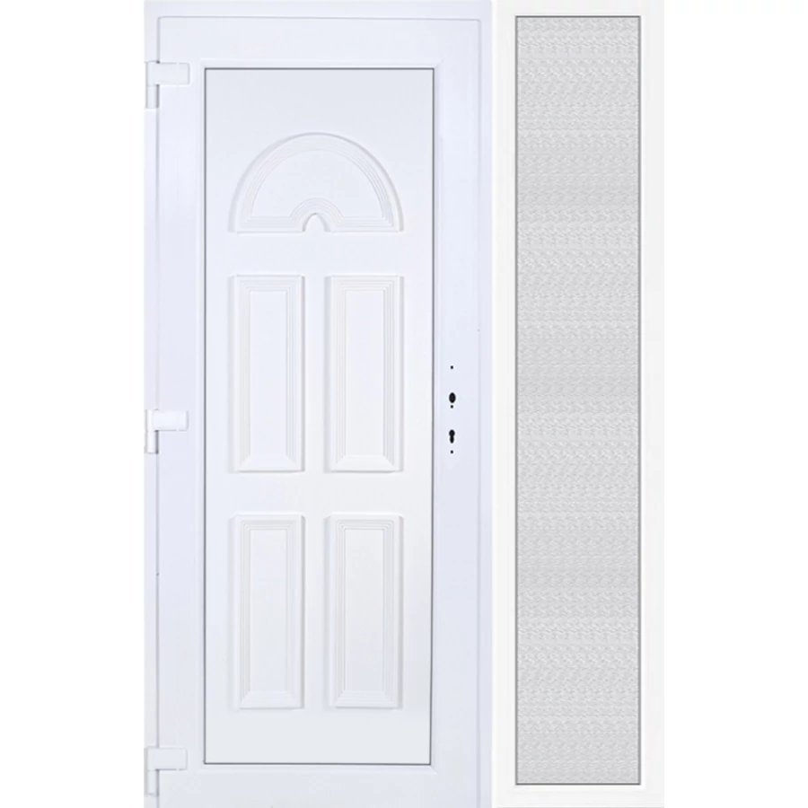 Kiváló hőszigetelésű műanyag bejárati ajtó 5 kamrás profilból, 70 mm beépítési mélységgel, tokban körbefutó idomacél merevítéssel. Vasalat: kilincsműködtetésű, 5 pontos ajtózárral, 3 db 3D erősített ajtópánttal, 35mm magas hőhídmentes alumínium küszöbbel. Dupla szürke ütközőtömítéssel rendelkezik. Üvegezése "GRÍZ" katedrál 2 rétegű Szuperlágybevonatos thermo üveg, 24 mm vastagságban, UG értéke: 1.0 W/m2K . A bejárati ajtó mindkét oldalán fehér színű. Nyitásmódja befelé nyíló, nyitásiránya balos ( bentről nézve a zsanér a bal oldalon helyezkedik el ). Tényleges tokkülmérete: 138 cm széles 208,5 cm magas. 98 cm széles 208,5 cm magas bejárati ajtóból, 40 cm széles 208,5 cm magas fix "GRÍZ" üvegezésű ( nem nyitható) oldalvilágítóból áll. ( két külön elem ami beépítéskor összeszerelendő). A nyílászáró ára nem tartalmazza a KILINCSET és a ZÁRBETÉTET a beszereléshez szükséges segédanyagokat (falkampó, csavar, pur-hab..stb.), külső-belső takaróléceket.