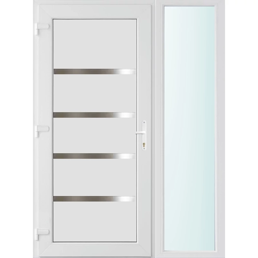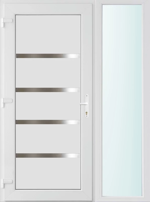 Kiváló hőszigetelésű műanyag bejárati ajtó 5 kamrás Pro line profilból, 70 mm beépítési mélységgel, tokban körbefutó idomacél merevítéssel. Vasalat: kilincsműködtetésű, VORNE 5 pontos ajtózárral, 3 db 3D erősített ajtópánttal, 20mm magas hőhídmentes alumínium küszöbbel. Dupla szürke ütközőtömítéssel rendelkezik. Üvegezése "SAVMART" katedrál 3 rétegű Szuperlágybevonatos thermo üveg, 40 mm vastagságban, UG értéke: 0.7 W/m2K . A bejárati ajtó mindkét oldalán fehér színű. Nyitásmódja befelé nyíló, nyitásiránya balos ( bentről nézve a zsanér a bal oldalon helyezkedik el ). Tényleges tokkülmérete: 138 cm széles 208 cm magas A nyílászáró ára nem tartalmazza a KILINCSET és a ZÁRBETÉTET a beszereléshez szükséges segédanyagokat (falkampó, csavar, pur-hab..stb.), külső-belső takaróléceket.