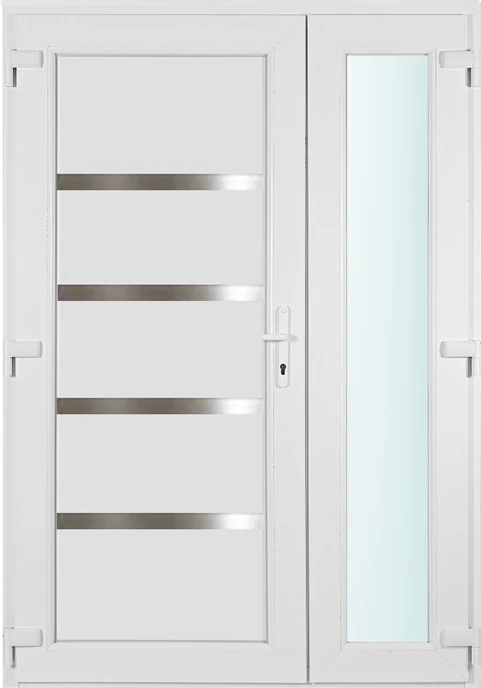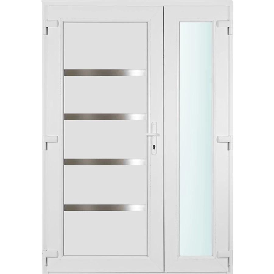 Kiváló hőszigetelésű műanyag bejárati ajtó 5 kamrás Pro line profilból, 70 mm beépítési mélységgel, tokban körbefutó idomacél merevítéssel. Vasalat: kilincsműködtetésű, VORNE 5 pontos ajtózárral, 3 db 3D erősített ajtópánttal, 20mm magas hőhídmentes alumínium küszöbbel. Dupla szürke ütközőtömítéssel rendelkezik. Üvegezése "SAVMART" katedrál 3 rétegű Szuperlágybevonatos thermo üveg, 40 mm vastagságban, UG értéke: 0.7 W/m2K . A bejárati ajtó mindkét oldalán fehér színű. Nyitásmódja asszimetrikus, 2 szárnyú befelé nyíló, nyitásiránya balos ( bentről nézve a zsanér a bal oldalon helyezkedik el ). Tényleges tokkülmérete: 138 cm széles 208 cm magas A nyílászáró ára nem tartalmazza a KILINCSET és a ZÁRBETÉTET a beszereléshez szükséges segédanyagokat (falkampó, csavar, pur-hab..stb.), külső-belső takaróléceket.