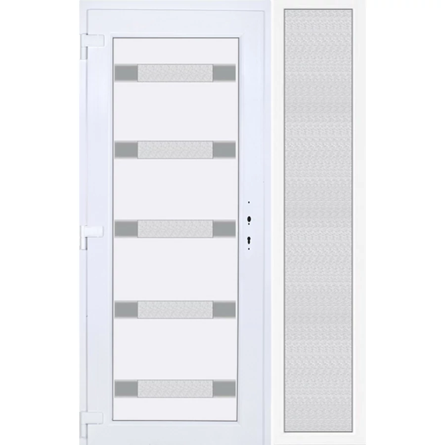EXTRA hőszigetelésű műanyag bejárati ajtó 5 kamrás profilból, 70 mm beépítési mélységgel, tokban körbefutó idomacél merevítéssel. Vasalat: kilincsműködtetésű, 5 pontos ajtózárral, 3 db 3D erősített ajtópánttal, 20mm magas hőhídmentes alumínium küszöbbel, + 20mm purenittel a küszöb alatt. Dupla szürke ütközőtömítéssel rendelkezik. Üvegezése "savmart" katedrál 3 RÉTEGŰ Szuperlágybevonatos thermo üveg, 42 mm vastagságban, UG értéke: 0,7 W/m2K . A bejárati ajtó mindkét oldalán fehér színű. Nyitásmódja befelé nyíló, nyitásiránya balos ( bentről nézve a zsanér a bal oldalon helyezkedik el ). Tényleges tokkülmérete: 138 cm széles 209 cm magas. 98 cm széles 209 cm magas bejárati ajtóból, 40 cm széles 209 cm magas fix "savmart" üvegezésű ( nem nyitható) oldalvilágítóból áll. ( két külön elem ami beépítéskor összeszerelendő). A nyílászáró ára nem tartalmazza a KILINCSET és a ZÁRBETÉTET a beszereléshez szükséges segédanyagokat (falkampó, csavar, pur-hab..stb.), külső-belső takaróléceket.