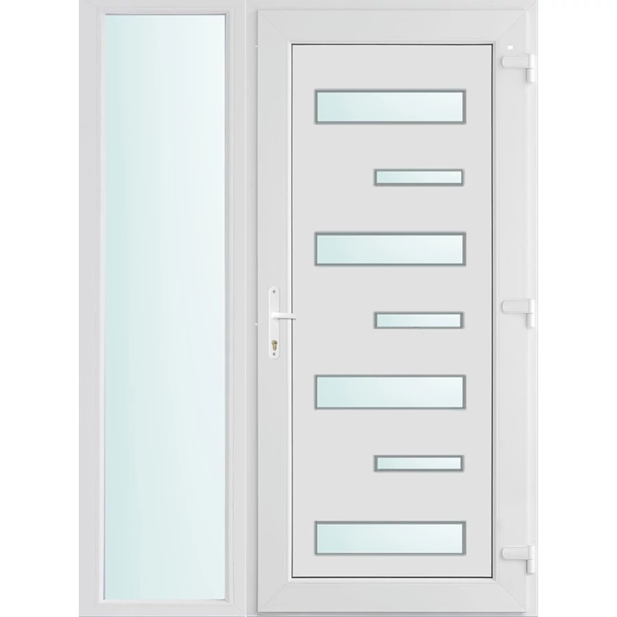 Műanyag bejárati ajtó 140x210 jobbos Alberta 7 üveges 3 rétegű üveggel extra vastag hőszigetelt panellal oldalvilágítóval 5 kamrás fehér