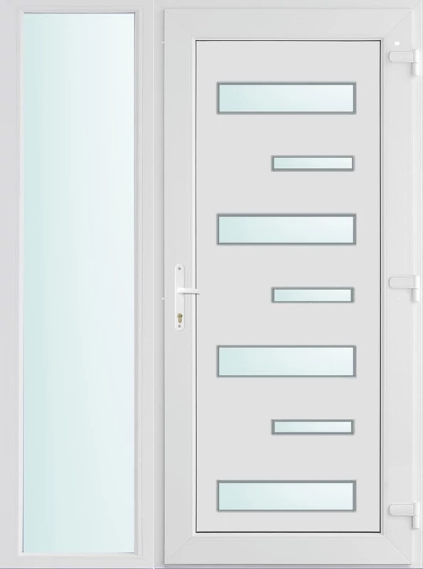 EXTRA hőszigetelésű műanyag bejárati ajtó 5 kamrás profilból, 70 mm beépítési mélységgel, tokban körbefutó idomacél merevítéssel. Vasalat: kilincsműködtetésű, 5 pontos ajtózárral, 3 db 3D erősített ajtópánttal, 20mm magas hőhídmentes alumínium küszöbbel, + 20mm purenittel a küszöb alatt. Dupla szürke ütközőtömítéssel rendelkezik. Üvegezése "savmart" katedrál 3 RÉTEGŰ Szuperlágybevonatos thermo üveg, 42 mm vastagságban, UG értéke: 0,7 W/m2K . A bejárati ajtó mindkét oldalán fehér színű. Nyitásmódja befelé nyíló, nyitásiránya jobbos ( bentről nézve a zsanér a jobb oldalon helyezkedik el ). Tényleges tokkülmérete: 138 cm széles 209 cm magas. 98 cm széles 209 cm magas bejárati ajtóból, 40 cm széles 209 cm magas fix "savmart" üvegezésű ( nem nyitható) oldalvilágítóból áll. ( két külön elem ami beépítéskor összeszerelendő). A nyílászáró ára nem tartalmazza a KILINCSET és a ZÁRBETÉTET a beszereléshez szükséges segédanyagokat (falkampó, csavar, pur-hab..stb.), külső-belső takaróléceket.