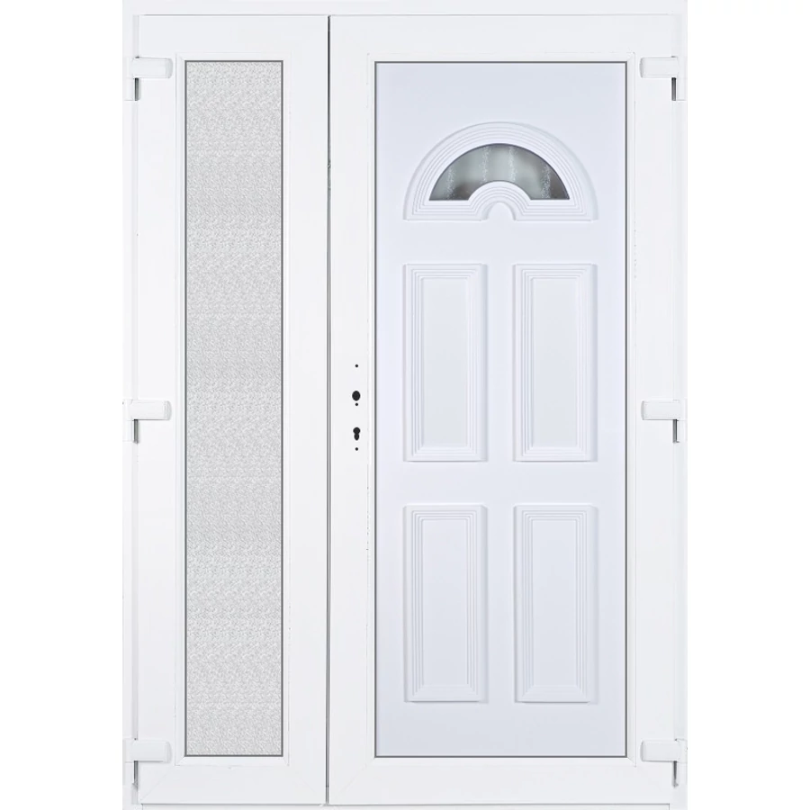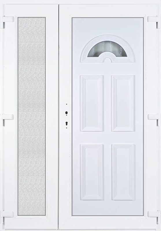 Kiváló hőszigetelésű műanyag bejárati ajtó 5 kamrás profilból, 70 mm beépítési mélységgel, tokban körbefutó idomacél merevítéssel. Vasalat: kilincsműködtetésű, 5 pontos ajtózárral, 3 db 3D erősített ajtópánttal, 35mm magas hőhídmentes alumínium küszöbbel. Dupla szürke ütközőtömítéssel rendelkezik. Üvegezése "GRÍZ" katedrál 2 rétegű Szuperlágybevonatos thermo üveg, 24 mm vastagságban, UG értéke: 1.0 W/m2K, a kisebb szárnyba végigfutó "GRÍZ" katedrál 2 rétegű Szuperlágybevonatos thermo üveg, 24 mm vastagságban kerül . A bejárati ajtó mindkét oldalán fehér színű. Nyitásmódja 2 szárnyú befelé nyíló, nyitásiránya jobbos ( bentről nézve a jobb oldali a nagyobb nyíló szárny ). Tényleges tokkülmérete: 138 cm széles 208,5 cm magas. A nyílászáró ára nem tartalmazza a KILINCSET és a ZÁRBETÉTET a beszereléshez szükséges segédanyagokat (falkampó, csavar, pur-hab..stb.), külső-belső takaróléceket.