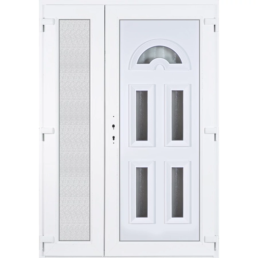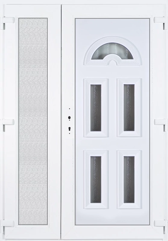 Kiváló hőszigetelésű műanyag bejárati ajtó 5 kamrás profilból, 70 mm beépítési mélységgel, tokban körbefutó idomacél merevítéssel. Vasalat: kilincsműködtetésű, 5 pontos ajtózárral, 3 db 3D erősített ajtópánttal, 35mm magas hőhídmentes alumínium küszöbbel. Dupla szürke ütközőtömítéssel rendelkezik. Üvegezése "GRÍZ" katedrál 2 rétegű Szuperlágybevonatos thermo üveg, 24 mm vastagságban, UG értéke: 1.0 W/m2K, a kisebb szárnyba végigfutó "GRÍZ" katedrál 2 rétegű Szuperlágybevonatos thermo üveg, 24 mm vastagságban kerül . A bejárati ajtó mindkét oldalán fehér színű. Nyitásmódja 2 szárnyú befelé nyíló, nyitásiránya jobbos ( bentről nézve a jobb oldali a nagyobb nyíló szárny ). Tényleges tokkülmérete: 138 cm széles 208,5 cm magas. A nyílászáró ára nem tartalmazza a KILINCSET és a ZÁRBETÉTET a beszereléshez szükséges segédanyagokat (falkampó, csavar, pur-hab..stb.), külső-belső takaróléceket.