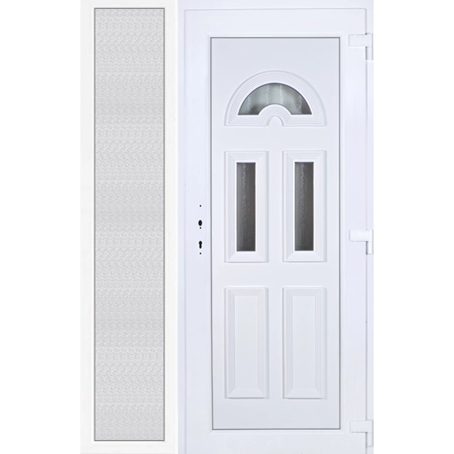 EXTRA hőszigetelésű műanyag bejárati ajtó 5 kamrás profilból, 70 mm beépítési mélységgel, tokban körbefutó idomacél merevítéssel. Vasalat: kilincsműködtetésű, 5 pontos ajtózárral, 3 db 3D erősített ajtópánttal, 20mm magas hőhídmentes alumínium küszöbbel, + 20mm purenittel a küszöb alatt. Dupla szürke ütközőtömítéssel rendelkezik. Üvegezése "savmart" katedrál 3 RÉTEGŰ Szuperlágybevonatos thermo üveg, 42 mm vastagságban, UG értéke: 0,7 W/m2K . A bejárati ajtó mindkét oldalán fehér színű. Nyitásmódja befelé nyíló, nyitásiránya jobbos ( bentről nézve a zsanér a jobb oldalon helyezkedik el ). Tényleges tokkülmérete: 138 cm széles 209 cm magas. 98 cm széles 209 cm magas bejárati ajtóból, 40 cm széles 209 cm magas fix "savmart" üvegezésű ( nem nyitható) oldalvilágítóból áll. ( két külön elem ami beépítéskor összeszerelendő). A nyílászáró ára nem tartalmazza a KILINCSET és a ZÁRBETÉTET a beszereléshez szükséges segédanyagokat (falkampó, csavar, pur-hab..stb.), külső-belső takaróléceket.