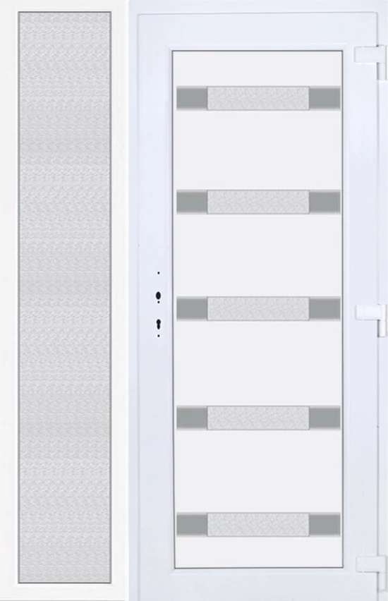 EXTRA hőszigetelésű műanyag bejárati ajtó 5 kamrás profilból, 70 mm beépítési mélységgel, tokban körbefutó idomacél merevítéssel. Vasalat: kilincsműködtetésű, 5 pontos ajtózárral, 3 db 3D erősített ajtópánttal, 20mm magas hőhídmentes alumínium küszöbbel, + 20mm purenittel a küszöb alatt. Dupla szürke ütközőtömítéssel rendelkezik. Üvegezése "savmart" katedrál 3 RÉTEGŰ Szuperlágybevonatos thermo üveg, 42 mm vastagságban, UG értéke: 0,7 W/m2K . A bejárati ajtó mindkét oldalán fehér színű. Nyitásmódja befelé nyíló, nyitásiránya jobbos ( bentről nézve a zsanér a jobb oldalon helyezkedik el ). Tényleges tokkülmérete: 138 cm széles 209 cm magas. 98 cm széles 209 cm magas bejárati ajtóból, 40 cm széles 209 cm magas fix "savmart" üvegezésű ( nem nyitható) oldalvilágítóból áll. ( két külön elem ami beépítéskor összeszerelendő). A nyílászáró ára nem tartalmazza a KILINCSET és a ZÁRBETÉTET a beszereléshez szükséges segédanyagokat (falkampó, csavar, pur-hab..stb.), külső-belső takaróléceket.