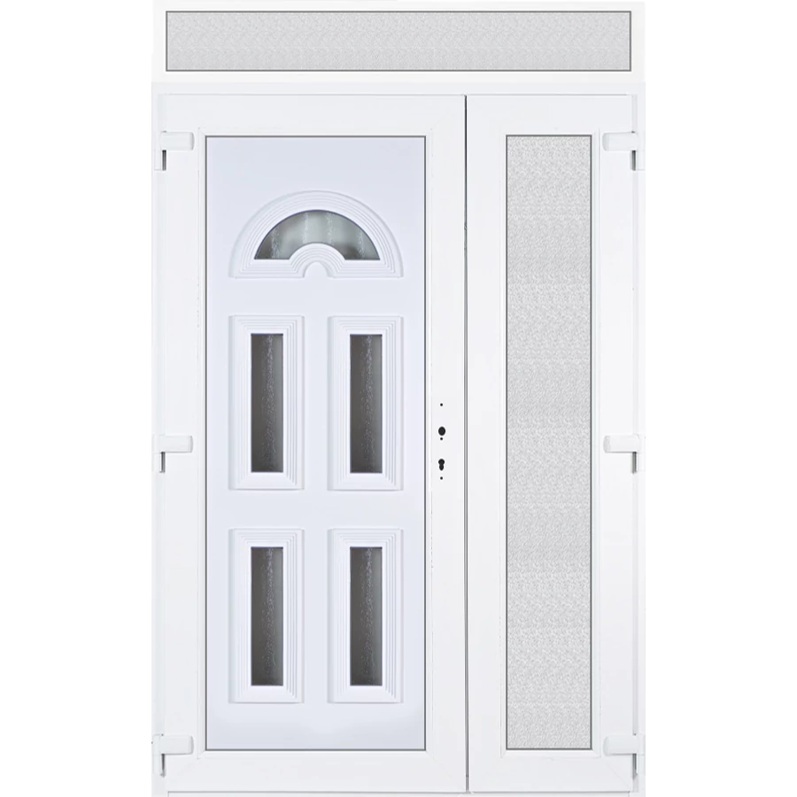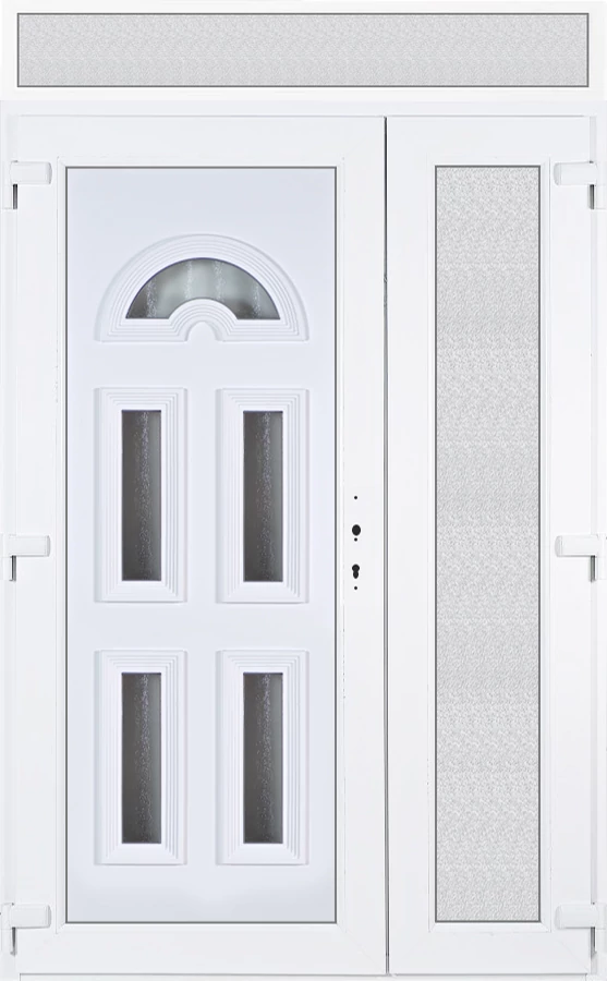 Kiváló hőszigetelésű műanyag bejárati ajtó 5 kamrás profilból, 70 mm beépítési mélységgel, tokban körbefutó idomacél merevítéssel. Vasalat: kilincsműködtetésű, 5 pontos ajtózárral, 3 db 3D erősített ajtópánttal, 35mm magas hőhídmentes alumínium küszöbbel. Dupla szürke ütközőtömítéssel rendelkezik. Üvegezése "GRÍZ" katedrál 2 rétegű Szuperlágybevonatos thermo üveg, 24 mm vastagságban, UG értéke: 1.0 W/m2K, a kisebb szárnyba végigfutó "GRÍZ" katedrál 2 rétegű Szuperlágybevonatos thermo üveg, 24 mm vastagságban kerül . A bejárati ajtó mindkét oldalán fehér színű. Nyitásmódja 2 szárnyú befelé nyíló, nyitásiránya balos ( bentről nézve a bal oldali a nagyobb nyíló szárny ). Tényleges tokkülmérete: 138 cm széles 238,5 cm magas. 138 cm széles 208,5 cm magas bejárati ajtóból, és egy138 cm széles 30 cm magas fix "GRÍZ" üvegezésű ( nem nyitható) felülvilágítóból áll. ( két külön elem ami beépítéskor összeszerelendő). A nyílászáró ára nem tartalmazza a KILINCSET és a ZÁRBETÉTET a beszereléshez szükséges segédanyagokat (falkampó, csavar, pur-hab..stb.), külső-belső takaróléceket.
