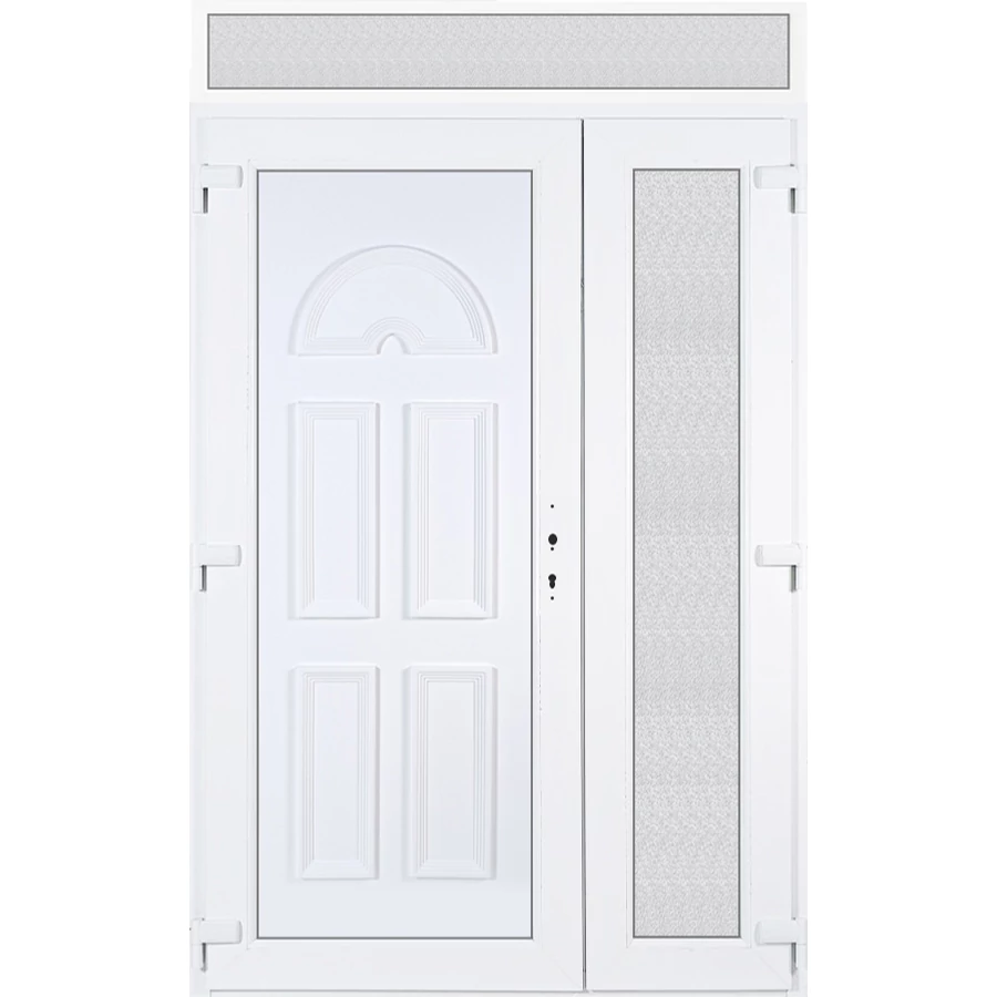 Kiváló hőszigetelésű műanyag bejárati ajtó 5 kamrás profilból, 70 mm beépítési mélységgel, tokban körbefutó idomacél merevítéssel. Vasalat: kilincsműködtetésű, 5 pontos ajtózárral, 3 db 3D erősített ajtópánttal, 35mm magas hőhídmentes alumínium küszöbbel. Dupla szürke ütközőtömítéssel rendelkezik. Üvegezése "GRÍZ" katedrál 2 rétegű Szuperlágybevonatos thermo üveg, 24 mm vastagságban, UG értéke: 1.0 W/m2K, a kisebb szárnyba végigfutó "GRÍZ" katedrál 2 rétegű Szuperlágybevonatos thermo üveg, 24 mm vastagságban kerül . A bejárati ajtó mindkét oldalán fehér színű. Nyitásmódja 2 szárnyú befelé nyíló, nyitásiránya balos ( bentről nézve a bal oldali a nagyobb nyíló szárny ). Tényleges tokkülmérete: 138 cm széles 238,5 cm magas. 138 cm széles 208,5 cm magas bejárati ajtóból, és egy138 cm széles 30 cm magas fix "GRÍZ" üvegezésű ( nem nyitható) felülvilágítóból áll. ( két külön elem ami beépítéskor összeszerelendő). A nyílászáró ára nem tartalmazza a KILINCSET és a ZÁRBETÉTET a beszereléshez szükséges segédanyagokat (falkampó, csavar, pur-hab..stb.), külső-belső takaróléceket.
