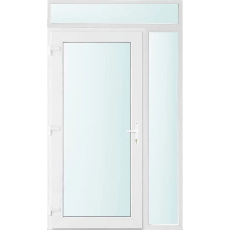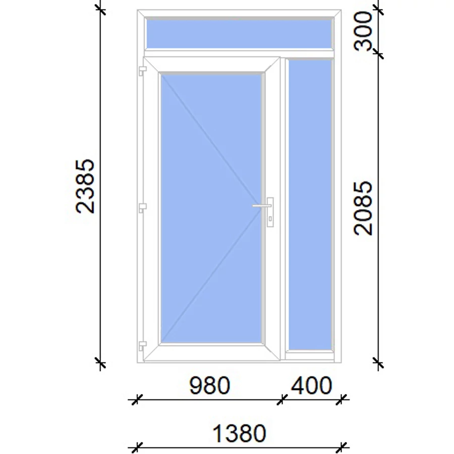 Kiváló hőszigetelésű műanyag bejárati ajtó 5 kamrás profilból, 70 mm beépítési mélységgel, tokban körbefutó idomacél merevítéssel. Vasalat: kilincsműködtetésű, VORNE 5 pontos ajtózárral, 3 db 3D erősített ajtópánttal, 20mm magas hőhídmentes alumínium küszöbbel. Dupla szürke ütközőtömítéssel rendelkezik. Üvegezése "VÍZTISZTA" 2 rétegű Szuper lágy bevonatos thermo üveg, 24 mm vastagságban, UG értéke: 1.0 W/m2K . A bejárati ajtó mindkét oldalán fehér színű. Nyitásmódja befelé nyíló, nyitásiránya balos ( bentről nézve a zsanér a bal oldalon helyezkedik el ). Tényleges tokkülmérete: 138 cm széles 238 cm magas. 98 cm széles 208 cm magas bejárati ajtóból,40 cm széles 208 cm magas fix "SAVMART vagy VÍZTISZTA" üvegezésű ( nem nyitható) oldalvilágítóból és egy 138 cm széles 30 cm magas fix "SAVMART vagy VÍZTISZTA" üvegezésű ( nem nyitható) felülvilágítóból áll. ( három külön elem ami beépítéskor összeszerelendő). A nyílászáró ára nem tartalmazza a KILINCSET és a ZÁRBETÉTET a beszereléshez szükséges segédanyagokat (falkampó, csavar, pur-hab..stb.), külső-belső takaróléceket.