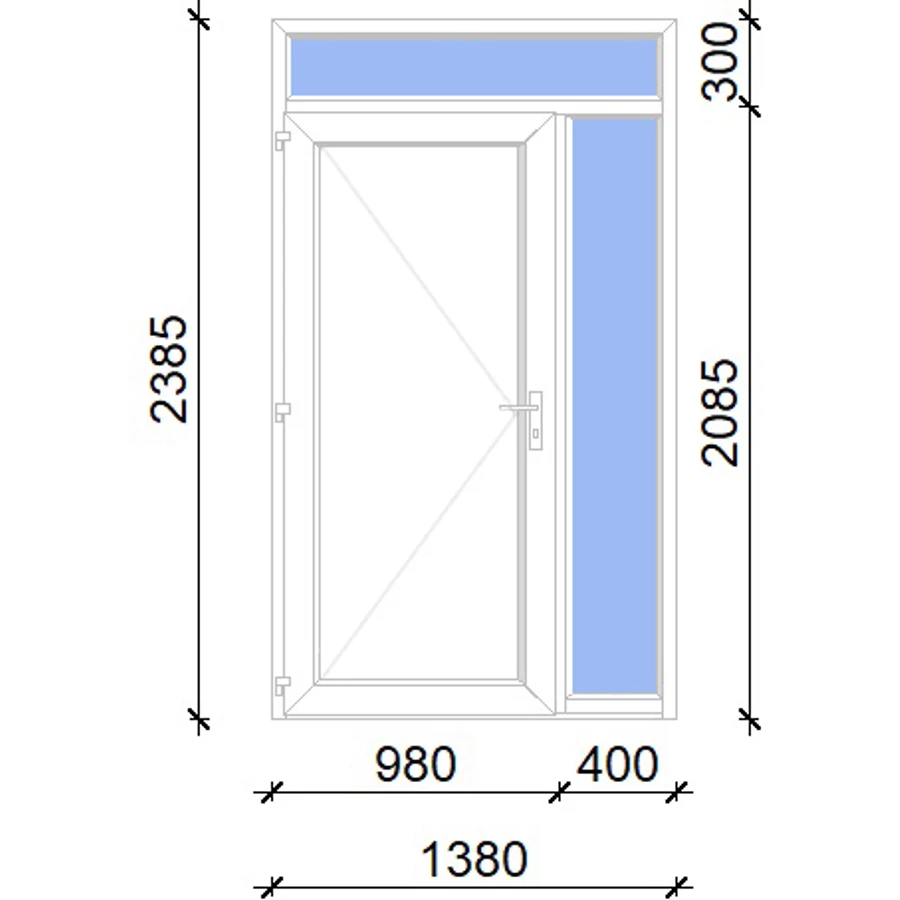 Kiváló hőszigetelésű műanyag bejárati ajtó 5 kamrás profilból, 70 mm beépítési mélységgel, tokban körbefutó idomacél merevítéssel. Vasalat: kilincsműködtetésű, VORNE 5 pontos ajtózárral, 3 db 3D erősített ajtópánttal, 20mm magas hőhídmentes alumínium küszöbbel. Dupla szürke ütközőtömítéssel rendelkezik. Üvegezése "SAVMART" katedrál 2 rétegű Szuperlágybevonatos thermo üveg, 24 mm vastagságban, UG értéke: 1.0 W/m2K . A bejárati ajtó mindkét oldalán fehér színű. Nyitásmódja befelé nyíló, nyitásiránya balos ( bentről nézve a zsanér a bal oldalon helyezkedik el ). Tényleges tokkülmérete: 138 cm széles 238 cm magas. 98 cm széles 208 cm magas bejárati ajtóból,40 cm széles 208 cm magas fix "SAVMART" üvegezésű ( nem nyitható) oldalvilágítóból és egy 138 cm széles 30 cm magas fix "SAVMART" üvegezésű ( nem nyitható) felülvilágítóból áll. ( három külön elem ami beépítéskor összeszerelendő). A nyílászáró ára nem tartalmazza a KILINCSET és a ZÁRBETÉTET a beszereléshez szükséges segédanyagokat (falkampó, csavar, pur-hab..stb.), külső-belső takaróléceket.