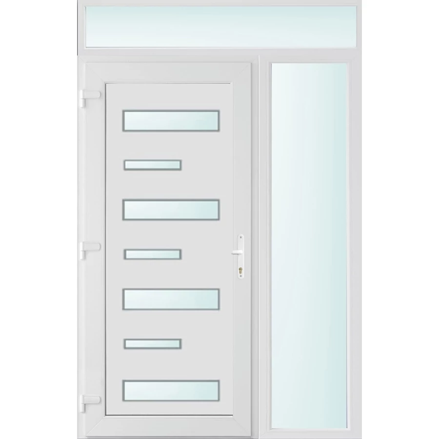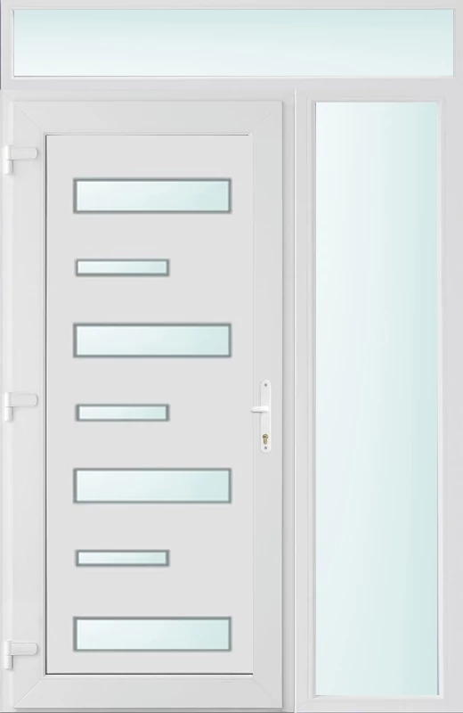 Kiváló hőszigetelésű műanyag bejárati ajtó 5 kamrás profilból, 70 mm beépítési mélységgel, tokban körbefutó idomacél merevítéssel. Vasalat: kilincsműködtetésű, VORNE 5 pontos ajtózárral, 3 db 3D erősített ajtópánttal, 20mm magas hőhídmentes alumínium küszöbbel. Dupla szürke ütközőtömítéssel rendelkezik. Üvegezése "SAVMART" katedrál 2 rétegű Szuperlágybevonatos thermo üveg, 24 mm vastagságban, UG értéke: 1.0 W/m2K . A bejárati ajtó mindkét oldalán fehér színű. Nyitásmódja befelé nyíló, nyitásiránya balos ( bentről nézve a zsanér a bal oldalon helyezkedik el ). Tényleges tokkülmérete: 138 cm széles 238 cm magas. 98 cm széles 208 cm magas bejárati ajtóból,40 cm széles 208 cm magas fix "SAVMART" üvegezésű ( nem nyitható) oldalvilágítóból és egy 138 cm széles 30 cm magas fix "SAVMART" üvegezésű ( nem nyitható) felülvilágítóból áll. ( három külön elem ami beépítéskor összeszerelendő). A nyílászáró ára nem tartalmazza a KILINCSET és a ZÁRBETÉTET a beszereléshez szükséges segédanyagokat (falkampó, csavar, pur-hab..stb.), külső-belső takaróléceket.