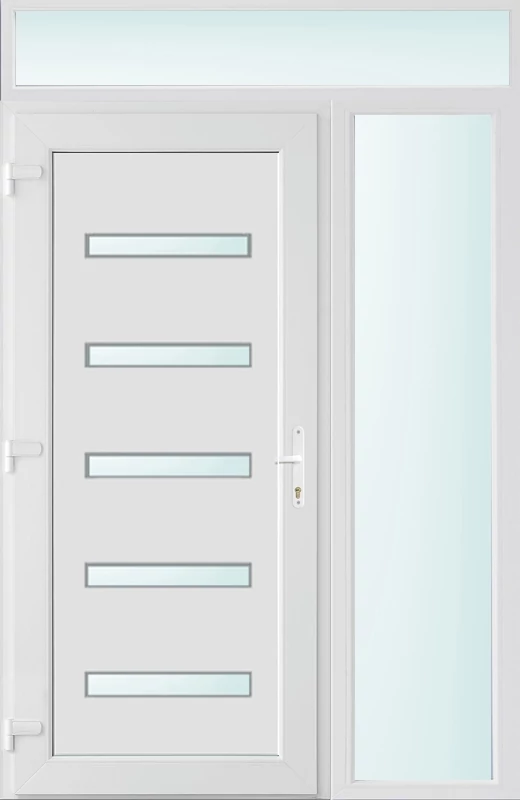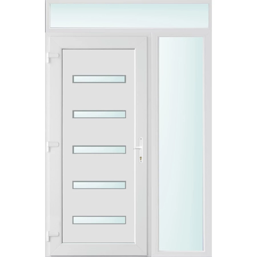 Kiváló hőszigetelésű műanyag bejárati ajtó 5 kamrás profilból, 70 mm beépítési mélységgel, tokban körbefutó idomacél merevítéssel. Vasalat: kilincsműködtetésű, VORNE 5 pontos ajtózárral, 3 db 3D erősített ajtópánttal, 20mm magas hőhídmentes alumínium küszöbbel. Dupla szürke ütközőtömítéssel rendelkezik. Üvegezése "SAVMART" katedrál 2 rétegű Szuperlágybevonatos thermo üveg, 24 mm vastagságban, UG értéke: 1.0 W/m2K . A bejárati ajtó mindkét oldalán fehér színű. Nyitásmódja befelé nyíló, nyitásiránya balos ( bentről nézve a zsanér a bal oldalon helyezkedik el ). Tényleges tokkülmérete: 138 cm széles 238 cm magas. 98 cm széles 208 cm magas bejárati ajtóból,40 cm széles 208 cm magas fix "SAVMART" üvegezésű ( nem nyitható) oldalvilágítóból és egy 138 cm széles 30 cm magas fix "SAVMART" üvegezésű ( nem nyitható) felülvilágítóból áll. ( három külön elem ami beépítéskor összeszerelendő). A nyílászáró ára nem tartalmazza a KILINCSET és a ZÁRBETÉTET a beszereléshez szükséges segédanyagokat (falkampó, csavar, pur-hab..stb.), külső-belső takaróléceket.
