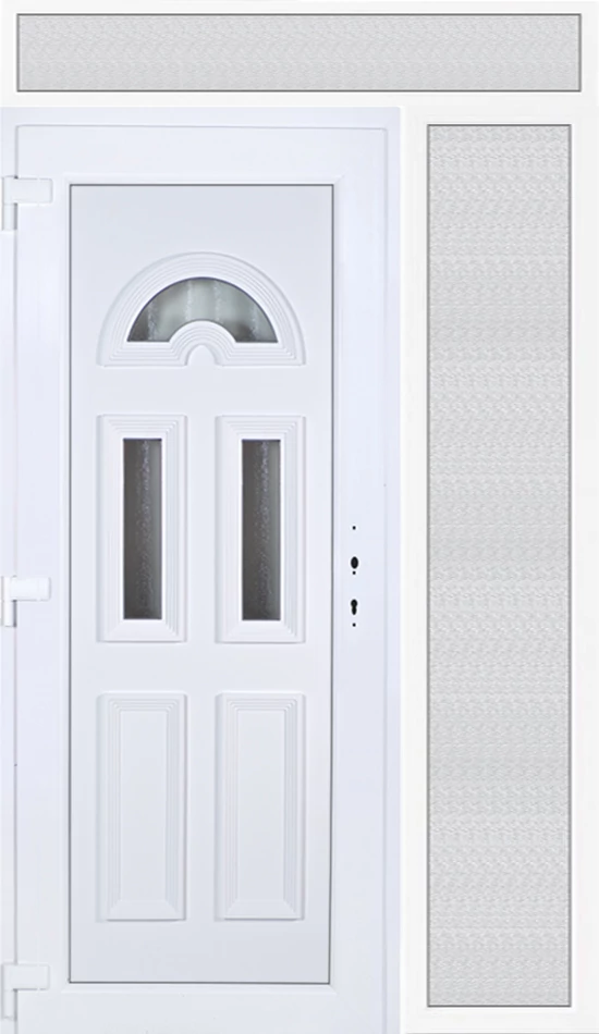 Kiváló hőszigetelésű műanyag bejárati ajtó 5 kamrás profilból, 70 mm beépítési mélységgel, tokban körbefutó idomacél merevítéssel. Vasalat: kilincsműködtetésű, 5 pontos ajtózárral, 3 db 3D erősített ajtópánttal, 35mm magas hőhídmentes alumínium küszöbbel. Dupla szürke ütközőtömítéssel rendelkezik. Üvegezése "GRÍZ" katedrál 2 rétegű Szuperlágybevonatos thermo üveg, 24 mm vastagságban, UG értéke: 1.0 W/m2K . A bejárati ajtó mindkét oldalán fehér színű. Nyitásmódja befelé nyíló, nyitásiránya balos ( bentről nézve a zsanér a bal oldalon helyezkedik el ). Tényleges tokkülmérete: 138 cm széles 238,5 cm magas. 98 cm széles 208,5 cm magas bejárati ajtóból,40 cm széles 208,5 cm magas fix "GRÍZ" üvegezésű ( nem nyitható) oldalvilágítóból és egy 138 cm széles 30 cm magas fix "GRÍZ" üvegezésű ( nem nyitható) felülvilágítóból áll. ( három külön elem ami beépítéskor összeszerelendő). A nyílászáró ára nem tartalmazza a KILINCSET és a ZÁRBETÉTET a beszereléshez szükséges segédanyagokat (falkampó, csavar, pur-hab..stb.), külső-belső takaróléceket.