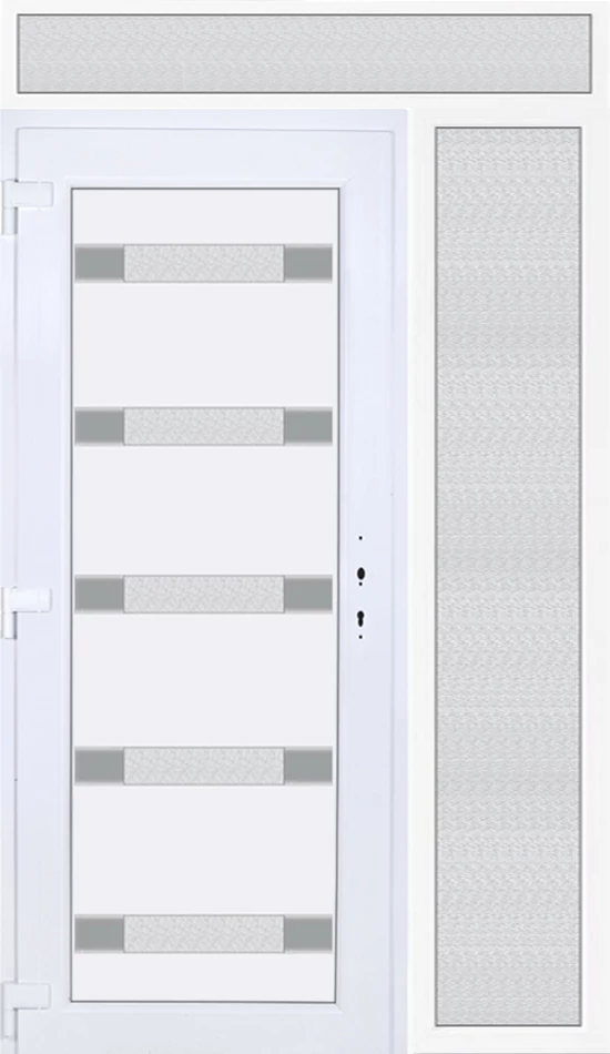 Kiváló hőszigetelésű műanyag bejárati ajtó 5 kamrás profilból, 70 mm beépítési mélységgel, tokban körbefutó idomacél merevítéssel. Vasalat: kilincsműködtetésű, 5 pontos ajtózárral, 3 db 3D erősített ajtópánttal, 35mm magas hőhídmentes alumínium küszöbbel. Dupla szürke ütközőtömítéssel rendelkezik. Üvegezése "GRÍZ" katedrál 2 rétegű Szuperlágybevonatos thermo üveg, 24 mm vastagságban, UG értéke: 1.0 W/m2K . A bejárati ajtó mindkét oldalán fehér színű. Nyitásmódja befelé nyíló, nyitásiránya balos ( bentről nézve a zsanér a bal oldalon helyezkedik el ). Tényleges tokkülmérete: 138 cm széles 238,5 cm magas. 98 cm széles 208,5 cm magas bejárati ajtóból,40 cm széles 208,5 cm magas fix "GRÍZ" üvegezésű ( nem nyitható) oldalvilágítóból és egy 138 cm széles 30 cm magas fix "GRÍZ" üvegezésű ( nem nyitható) felülvilágítóból áll. ( három külön elem ami beépítéskor összeszerelendő). A nyílászáró ára nem tartalmazza a KILINCSET és a ZÁRBETÉTET a beszereléshez szükséges segédanyagokat (falkampó, csavar, pur-hab..stb.), külső-belső takaróléceket.