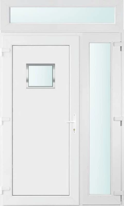 Kiváló hőszigetelésű műanyag bejárati ajtó 5 kamrás profilból, 70 mm beépítési mélységgel, tokban körbefutó idomacél merevítéssel. Vasalat: kilincsműködtetésű, VORNE 5 pontos ajtózárral, 3 db 3D erősített ajtópánttal, 20mm magas hőhídmentes alumínium küszöbbel. Dupla szürke ütközőtömítéssel rendelkezik. Üvegezése "SAVMART" katedrál 2 rétegű Szuperlágybevonatos thermo üveg, 24 mm vastagságban, UG értéke: 1.0 W/m2K . A bejárati ajtó mindkét oldalán fehér színű. Nyitásmódja befelé nyíló, nyitásiránya balos ( bentről nézve a zsanér a bal oldalon helyezkedik el ). Tényleges tokkülmérete: 138 cm széles 238 cm magas. 98 cm széles 208 cm magas bejárati ajtóból,40 cm széles 208 cm magas fix "SAVMART" üvegezésű ( nem nyitható) oldalvilágítóból és egy 138 cm széles 30 cm magas fix "SAVMART" üvegezésű ( nem nyitható) felülvilágítóból áll. ( három külön elem ami beépítéskor összeszerelendő). A nyílászáró ára nem tartalmazza a KILINCSET és a ZÁRBETÉTET a beszereléshez szükséges segédanyagokat (falkampó, csavar, pur-hab..stb.), külső-belső takaróléceket.