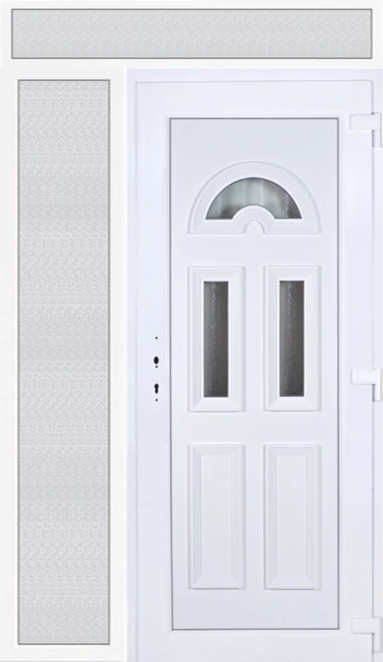 Kiváló hőszigetelésű műanyag bejárati ajtó 5 kamrás profilból, 70 mm beépítési mélységgel, tokban körbefutó idomacél merevítéssel. Vasalat: kilincsműködtetésű, 5 pontos ajtózárral, 3 db 3D erősített ajtópánttal, 35mm magas hőhídmentes alumínium küszöbbel. Dupla szürke ütközőtömítéssel rendelkezik. Üvegezése "GRÍZ" katedrál 2 rétegű Szuperlágybevonatos thermo üveg, 24 mm vastagságban, UG értéke: 1.0 W/m2K . A bejárati ajtó mindkét oldalán fehér színű. Nyitásmódja befelé nyíló, nyitásiránya jobbos ( bentről nézve a zsanér a jobb oldalon helyezkedik el ). Tényleges tokkülmérete: 138 cm széles 238,5 cm magas. 98 cm széles 208,5 cm magas bejárati ajtóból,40 cm széles 208,5 cm magas fix "GRÍZ" üvegezésű ( nem nyitható) oldalvilágítóból és egy 138 cm széles 30 cm magas fix "GRÍZ" üvegezésű ( nem nyitható) felülvilágítóból áll. ( három külön elem ami beépítéskor összeszerelendő). A nyílászáró ára nem tartalmazza a KILINCSET és a ZÁRBETÉTET a beszereléshez szükséges segédanyagokat (falkampó, csavar, pur-hab..stb.), külső-belső takaróléceket.