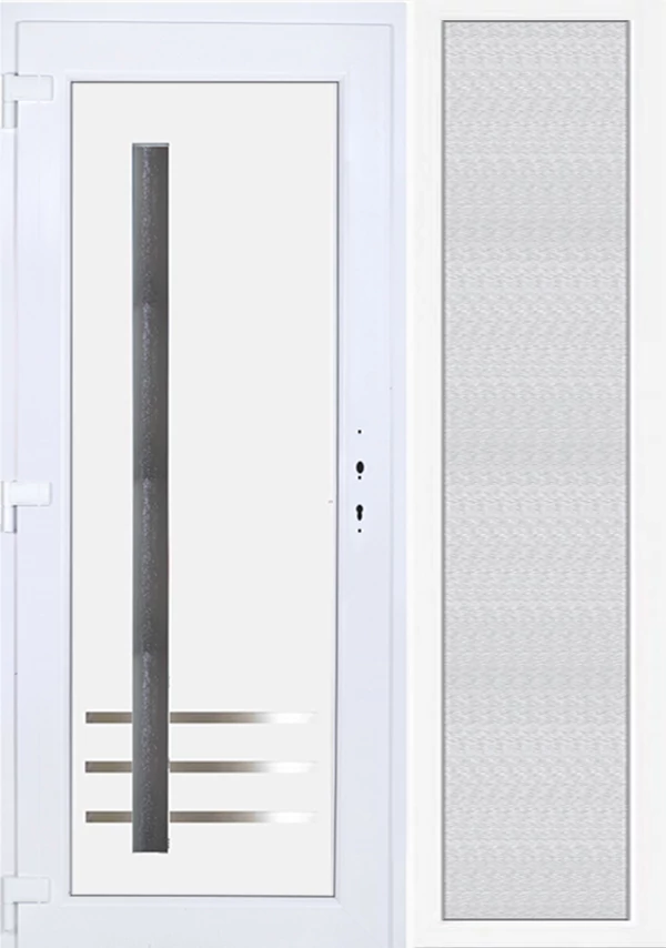 Kiváló hőszigetelésű műanyag bejárati ajtó 5 kamrás profilból, 70 mm beépítési mélységgel, tokban körbefutó idomacél merevítéssel. Vasalat: kilincsműködtetésű, 5 pontos ajtózárral, 3 db 3D erősített ajtópánttal, 35mm magas hőhídmentes alumínium küszöbbel. Dupla szürke ütközőtömítéssel rendelkezik. Üvegezése "GRÍZ" katedrál 2 rétegű Szuperlágybevonatos thermo üveg, 24 mm vastagságban, UG értéke: 1.0 W/m2K . A bejárati ajtó mindkét oldalán fehér színű. Nyitásmódja befelé nyíló, nyitásiránya balos ( bentről nézve a zsanér a bal oldalon helyezkedik el ). Tényleges tokkülmérete: 148 cm széles 208,5 cm magas. 98 cm széles 208,5 cm magas bejárati ajtóból, 50 cm széles 208,5 cm magas fix "GRÍZ" üvegezésű ( nem nyitható) oldalvilágítóból áll. ( két külön elem ami beépítéskor összeszerelendő). A nyílászáró ára nem tartalmazza a KILINCSET és a ZÁRBETÉTET a beszereléshez szükséges segédanyagokat (falkampó, csavar, pur-hab..stb.), külső-belső takaróléceket.