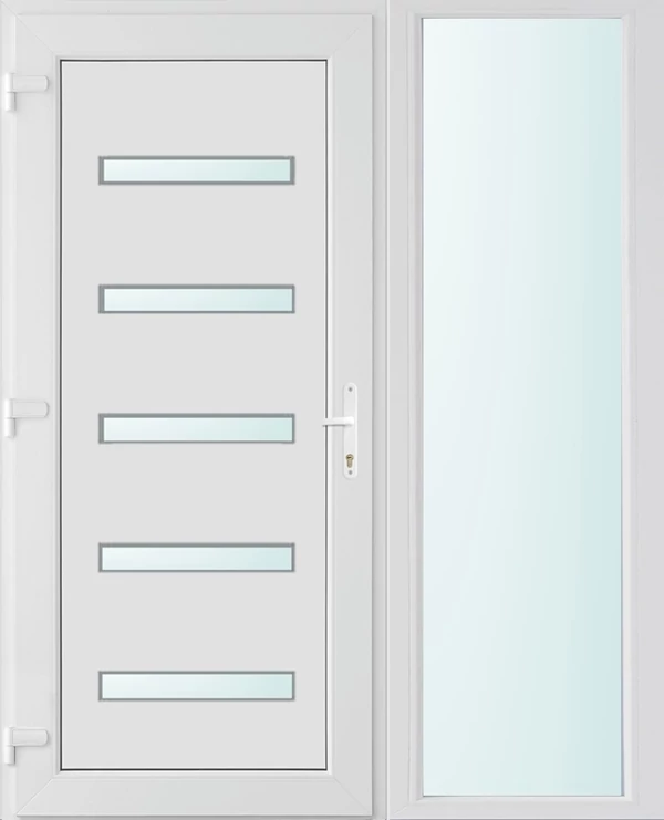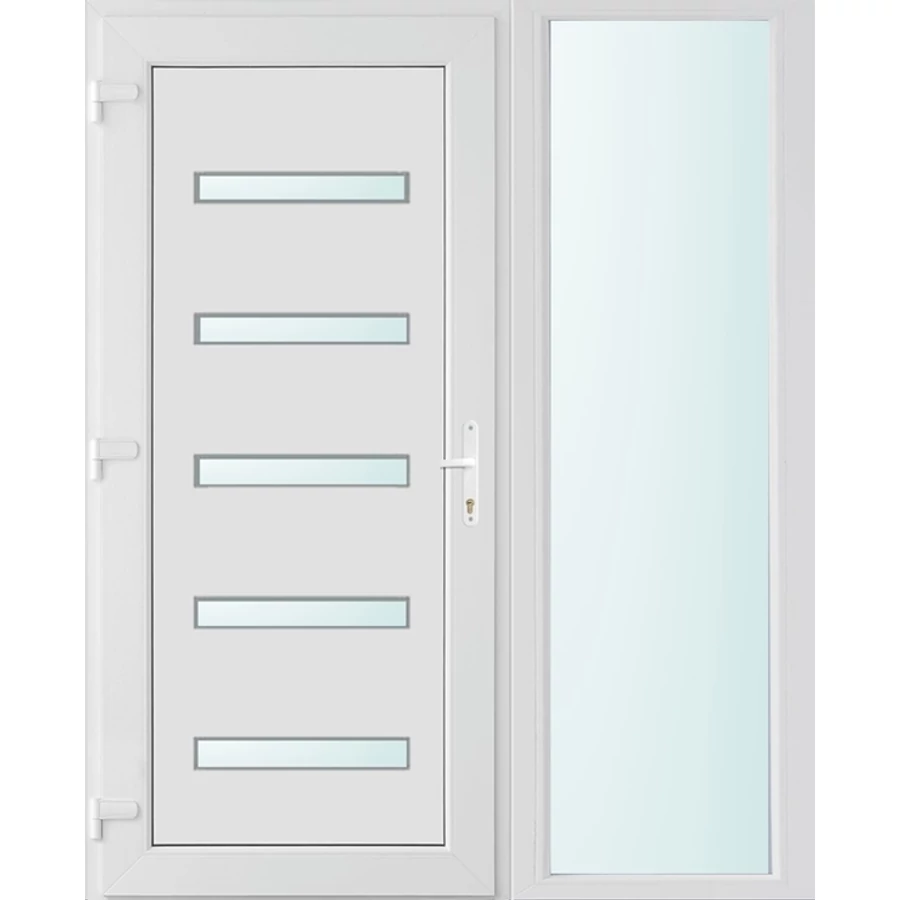 Kiváló hőszigetelésű műanyag bejárati ajtó 5 kamrás profilból, 70 mm beépítési mélységgel, tokban körbefutó idomacél merevítéssel. Vasalat: kilincsműködtetésű, VORNE 5 pontos ajtózárral, 3 db 3D erősített ajtópánttal, 20mm magas hőhídmentes alumínium küszöbbel. Dupla szürke ütközőtömítéssel rendelkezik. Üvegezése "SAVMART" katedrál 2 rétegű Szuperlágybevonatos thermo üveg, 24 mm vastagságban, UG értéke: 1.0 W/m2K . A bejárati ajtó mindkét oldalán fehér színű. Nyitásmódja befelé nyíló, nyitásiránya balos ( bentről nézve a zsanér a bal oldalon helyezkedik el ). Tényleges tokkülmérete: 148 cm széles 208 cm magas. 98 cm széles 208 cm magas bejárati ajtóból, 50 cm széles 208 cm magas fix "SAVMART" üvegezésű ( nem nyitható) oldalvilágítóból áll. ( két külön elem ami beépítéskor összeszerelendő). A nyílászáró ára nem tartalmazza a KILINCSET és a ZÁRBETÉTET a beszereléshez szükséges segédanyagokat (falkampó, csavar, pur-hab..stb.), külső-belső takaróléceket.