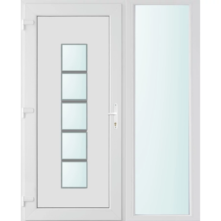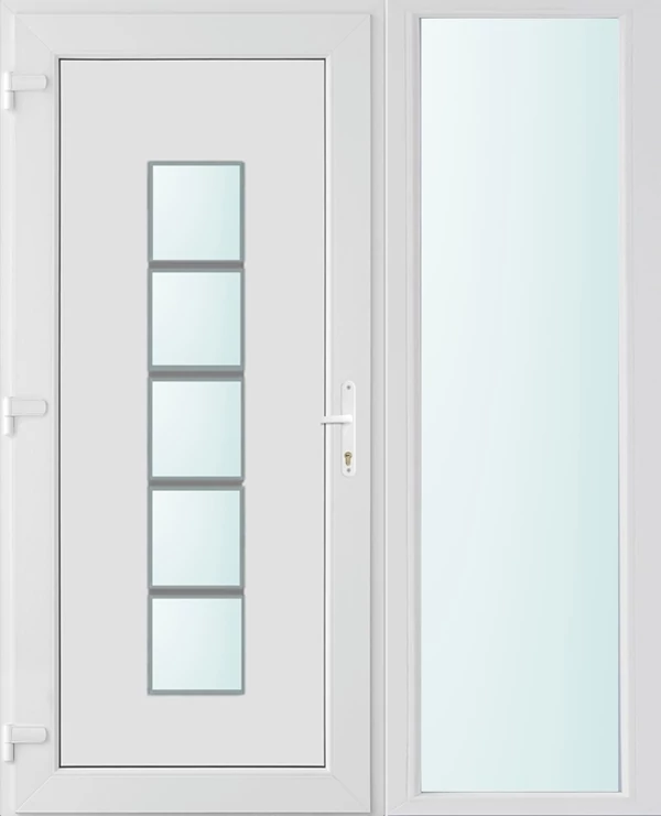 Kiváló hőszigetelésű műanyag bejárati ajtó 5 kamrás profilból, 70 mm beépítési mélységgel, tokban körbefutó idomacél merevítéssel. Vasalat: kilincsműködtetésű, VORNE 5 pontos ajtózárral, 3 db 3D erősített ajtópánttal, 20mm magas hőhídmentes alumínium küszöbbel. Dupla szürke ütközőtömítéssel rendelkezik. Üvegezése "SAVMART" katedrál 2 rétegű Szuperlágybevonatos thermo üveg, 24 mm vastagságban, UG értéke: 1.0 W/m2K . A bejárati ajtó mindkét oldalán fehér színű. Nyitásmódja befelé nyíló, nyitásiránya balos ( bentről nézve a zsanér a bal oldalon helyezkedik el ). Tényleges tokkülmérete: 148 cm széles 208 cm magas. 98 cm széles 208 cm magas bejárati ajtóból, 50 cm széles 208 cm magas fix "SAVMART" üvegezésű ( nem nyitható) oldalvilágítóból áll. ( két külön elem ami beépítéskor összeszerelendő). A nyílászáró ára nem tartalmazza a KILINCSET és a ZÁRBETÉTET a beszereléshez szükséges segédanyagokat (falkampó, csavar, pur-hab..stb.), külső-belső takaróléceket.