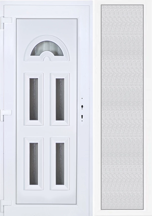 EXTRA hőszigetelésű műanyag bejárati ajtó 5 kamrás profilból, 70 mm beépítési mélységgel, tokban körbefutó idomacél merevítéssel. Vasalat: kilincsműködtetésű, 5 pontos ajtózárral, 3 db 3D erősített ajtópánttal, 20mm magas hőhídmentes alumínium küszöbbel, + 20mm purenittel a küszöb alatt. Dupla szürke ütközőtömítéssel rendelkezik. Üvegezése "savmart" katedrál 3 RÉTEGŰ Szuperlágybevonatos thermo üveg, 42 mm vastagságban, UG értéke: 0,7 W/m2K . A bejárati ajtó mindkét oldalán fehér színű. Nyitásmódja befelé nyíló, nyitásiránya balos ( bentről nézve a zsanér a bal oldalon helyezkedik el ). Tényleges tokkülmérete: 148 cm széles 209 cm magas. 98 cm széles 209 cm magas bejárati ajtóból, 50 cm széles 209 cm magas fix "savmart" üvegezésű ( nem nyitható) oldalvilágítóból áll. ( két külön elem ami beépítéskor összeszerelendő). A nyílászáró ára nem tartalmazza a KILINCSET és a ZÁRBETÉTET a beszereléshez szükséges segédanyagokat (falkampó, csavar, pur-hab..stb.), külső-belső takaróléceket.