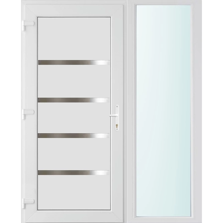 Kiváló hőszigetelésű műanyag bejárati ajtó 5 kamrás Pro line profilból, 70 mm beépítési mélységgel, tokban körbefutó idomacél merevítéssel. Vasalat: kilincsműködtetésű, VORNE 5 pontos ajtózárral, 3 db 3D erősített ajtópánttal, 20mm magas hőhídmentes alumínium küszöbbel. Dupla szürke ütközőtömítéssel rendelkezik. Üvegezése "SAVMART" katedrál 3 rétegű Szuperlágybevonatos thermo üveg, 40 mm vastagságban, UG értéke: 0.7 W/m2K . A bejárati ajtó mindkét oldalán fehér színű. Nyitásmódja befelé nyíló, nyitásiránya balos ( bentről nézve a zsanér a bal oldalon helyezkedik el ). Tényleges tokkülmérete: 148 cm széles 208 cm magas A nyílászáró ára nem tartalmazza a KILINCSET és a ZÁRBETÉTET a beszereléshez szükséges segédanyagokat (falkampó, csavar, pur-hab..stb.), külső-belső takaróléceket.