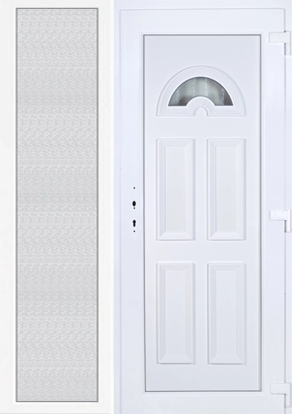 EXTRA hőszigetelésű műanyag bejárati ajtó 5 kamrás profilból, 70 mm beépítési mélységgel, tokban körbefutó idomacél merevítéssel. Vasalat: kilincsműködtetésű, 5 pontos ajtózárral, 3 db 3D erősített ajtópánttal, 20mm magas hőhídmentes alumínium küszöbbel, + 20mm purenittel a küszöb alatt. Dupla szürke ütközőtömítéssel rendelkezik. Üvegezése "savmart" katedrál 3 RÉTEGŰ Szuperlágybevonatos thermo üveg, 42 mm vastagságban, UG értéke: 0,7 W/m2K . A bejárati ajtó mindkét oldalán fehér színű. Nyitásmódja befelé nyíló, nyitásiránya jobbos ( bentről nézve a zsanér a jobb oldalon helyezkedik el ). Tényleges tokkülmérete: 148 cm széles 209 cm magas. 98 cm széles 209 cm magas bejárati ajtóból, 50 cm széles 209 cm magas fix "savmart" üvegezésű ( nem nyitható) oldalvilágítóból áll. ( két külön elem ami beépítéskor összeszerelendő). A nyílászáró ára nem tartalmazza a KILINCSET és a ZÁRBETÉTET a beszereléshez szükséges segédanyagokat (falkampó, csavar, pur-hab..stb.), külső-belső takaróléceket.