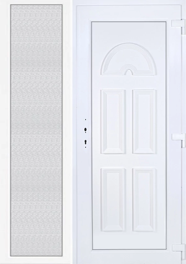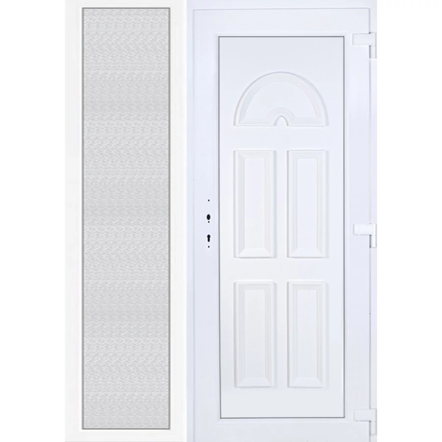 EXTRA hőszigetelésű műanyag bejárati ajtó 5 kamrás profilból, 70 mm beépítési mélységgel, tokban körbefutó idomacél merevítéssel. Vasalat: kilincsműködtetésű, 5 pontos ajtózárral, 3 db 3D erősített ajtópánttal, 20mm magas hőhídmentes alumínium küszöbbel, + 20mm purenittel a küszöb alatt. Dupla szürke ütközőtömítéssel rendelkezik. Üvegezése "savmart" katedrál 3 RÉTEGŰ Szuperlágybevonatos thermo üveg, 42 mm vastagságban, UG értéke: 0,7 W/m2K . A bejárati ajtó mindkét oldalán fehér színű. Nyitásmódja befelé nyíló, nyitásiránya jobbos ( bentről nézve a zsanér a jobb oldalon helyezkedik el ). Tényleges tokkülmérete: 148 cm széles 209 cm magas. 98 cm széles 209 cm magas bejárati ajtóból, 50 cm széles 209 cm magas fix "savmart" üvegezésű ( nem nyitható) oldalvilágítóból áll. ( két külön elem ami beépítéskor összeszerelendő). A nyílászáró ára nem tartalmazza a KILINCSET és a ZÁRBETÉTET a beszereléshez szükséges segédanyagokat (falkampó, csavar, pur-hab..stb.), külső-belső takaróléceket.