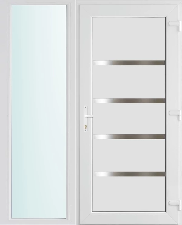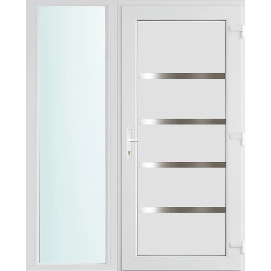 Kiváló hőszigetelésű műanyag bejárati ajtó 5 kamrás Pro line profilból, 70 mm beépítési mélységgel, tokban körbefutó idomacél merevítéssel. Vasalat: kilincsműködtetésű, VORNE 5 pontos ajtózárral, 3 db 3D erősített ajtópánttal, 20mm magas hőhídmentes alumínium küszöbbel. Dupla szürke ütközőtömítéssel rendelkezik. Üvegezése "SAVMART" katedrál 3 rétegű Szuperlágybevonatos thermo üveg, 40 mm vastagságban, UG értéke: 0.7 W/m2K . A bejárati ajtó mindkét oldalán fehér színű. Nyitásmódja befelé nyíló, nyitásiránya jobbos ( bentről nézve a zsanér a bal oldalon helyezkedik el ). Tényleges tokkülmérete: 148 cm széles 208 cm magas A nyílászáró ára nem tartalmazza a KILINCSET és a ZÁRBETÉTET a beszereléshez szükséges segédanyagokat (falkampó, csavar, pur-hab..stb.), külső-belső takaróléceket.