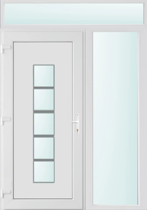 Kiváló hőszigetelésű műanyag bejárati ajtó 5 kamrás profilból, 70 mm beépítési mélységgel, tokban körbefutó idomacél merevítéssel. Vasalat: kilincsműködtetésű, VORNE 5 pontos ajtózárral, 3 db 3D erősített ajtópánttal, 20mm magas hőhídmentes alumínium küszöbbel. Dupla szürke ütközőtömítéssel rendelkezik. Üvegezése "SAVMART" katedrál 2 rétegű Szuperlágybevonatos thermo üveg, 24 mm vastagságban, UG értéke: 1.0 W/m2K . A bejárati ajtó mindkét oldalán fehér színű. Nyitásmódja befelé nyíló, nyitásiránya balos ( bentről nézve a zsanér a bal oldalon helyezkedik el ). Tényleges tokkülmérete: 148 cm széles 238 cm magas. 98 cm széles 208 cm magas bejárati ajtóból,50 cm széles 208 cm magas fix "SAVMART" üvegezésű ( nem nyitható) oldalvilágítóból és egy 148 cm széles 30 cm magas fix "SAVMART" üvegezésű ( nem nyitható) felülvilágítóból áll. ( három külön elem ami beépítéskor összeszerelendő). A nyílászáró ára nem tartalmazza a KILINCSET és a ZÁRBETÉTET a beszereléshez szükséges segédanyagokat (falkampó, csavar, pur-hab..stb.), külső-belső takaróléceket.