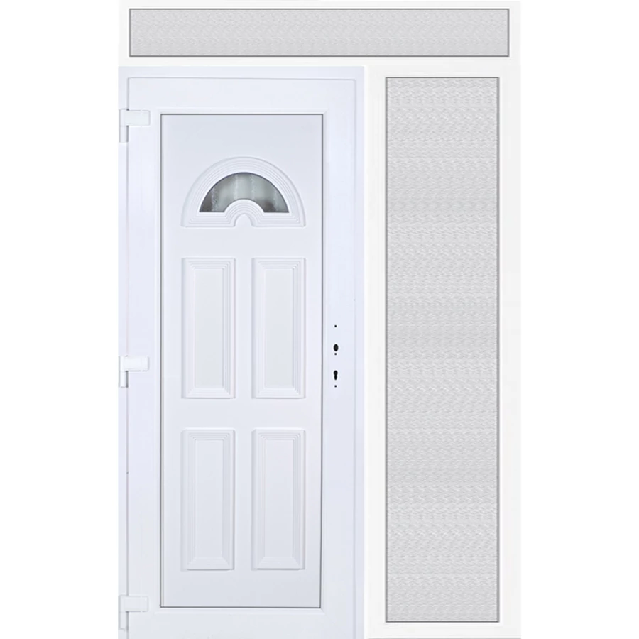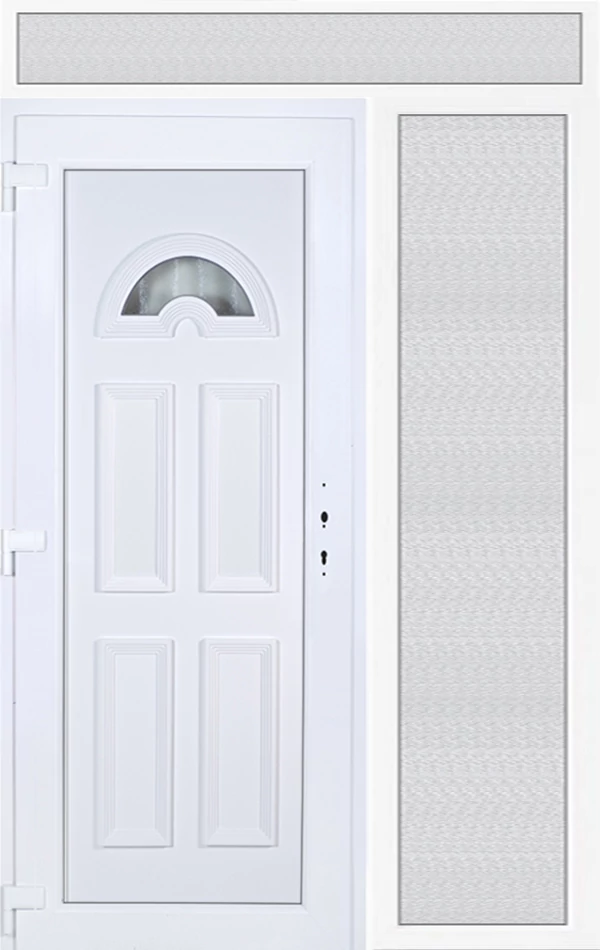 EXTRA hőszigetelésű műanyag bejárati ajtó 5 kamrás profilból, 70 mm beépítési mélységgel, tokban körbefutó idomacél merevítéssel. Vasalat: kilincsműködtetésű, 5 pontos ajtózárral, 3 db 3D erősített ajtópánttal, 20mm magas hőhídmentes alumínium küszöbbel, + 20mm purenittel a küszöb alatt. Dupla szürke ütközőtömítéssel rendelkezik. Üvegezése "savmart" katedrál 3 RÉTEGŰ Szuperlágybevonatos thermo üveg, 42 mm vastagságban, UG értéke: 0,7 W/m2K . A bejárati ajtó mindkét oldalán fehér színű. Nyitásmódja befelé nyíló, nyitásiránya balos ( bentről nézve a zsanér a bal oldalon helyezkedik el ). Tényleges tokkülmérete: 148 cm széles 239 cm magas. 98 cm széles 209 cm magas bejárati ajtóból, 50 cm széles 209 cm magas fix "savmart" üvegezésű ( nem nyitható) oldalvilágítóból és egy 148 cm széles 30 cm magas fix "savmart" üvegezésű ( nem nyitható) felülvilágítóból áll. ( három külön elem ami beépítéskor összeszerelendő). A nyílászáró ára nem tartalmazza a KILINCSET és a ZÁRBETÉTET a beszereléshez szükséges segédanyagokat (falkampó, csavar, pur-hab..stb.), külső-belső takaróléceket.