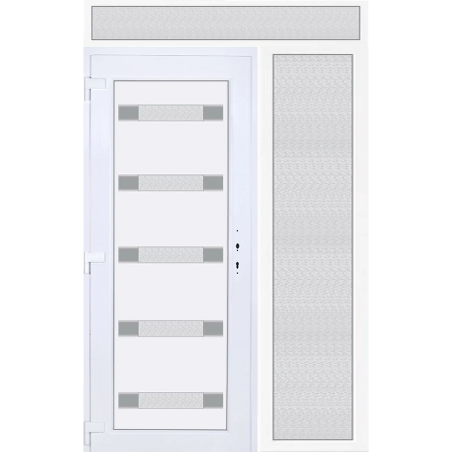 EXTRA hőszigetelésű műanyag bejárati ajtó 5 kamrás profilból, 70 mm beépítési mélységgel, tokban körbefutó idomacél merevítéssel. Vasalat: kilincsműködtetésű, 5 pontos ajtózárral, 3 db 3D erősített ajtópánttal, 20mm magas hőhídmentes alumínium küszöbbel, + 20mm purenittel a küszöb alatt. Dupla szürke ütközőtömítéssel rendelkezik. Üvegezése "savmart" katedrál 3 RÉTEGŰ Szuperlágybevonatos thermo üveg, 42 mm vastagságban, UG értéke: 0,7 W/m2K . A bejárati ajtó mindkét oldalán fehér színű. Nyitásmódja befelé nyíló, nyitásiránya balos ( bentről nézve a zsanér a bal oldalon helyezkedik el ). Tényleges tokkülmérete: 148 cm széles 239 cm magas. 98 cm széles 209 cm magas bejárati ajtóból, 50 cm széles 209 cm magas fix "savmart" üvegezésű ( nem nyitható) oldalvilágítóból és egy 148 cm széles 30 cm magas fix "savmart" üvegezésű ( nem nyitható) felülvilágítóból áll. ( három külön elem ami beépítéskor összeszerelendő). A nyílászáró ára nem tartalmazza a KILINCSET és a ZÁRBETÉTET a beszereléshez szükséges segédanyagokat (falkampó, csavar, pur-hab..stb.), külső-belső takaróléceket.