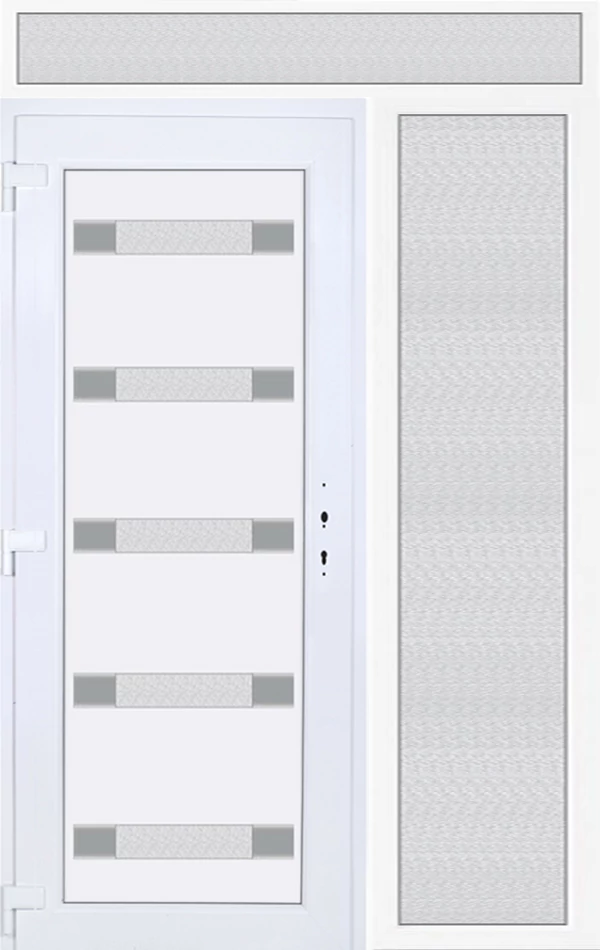 Kiváló hőszigetelésű műanyag bejárati ajtó 5 kamrás profilból, 70 mm beépítési mélységgel, tokban körbefutó idomacél merevítéssel. Vasalat: kilincsműködtetésű, 5 pontos ajtózárral, 3 db 3D erősített ajtópánttal, 35mm magas hőhídmentes alumínium küszöbbel. Dupla szürke ütközőtömítéssel rendelkezik. Üvegezése "GRÍZ" katedrál 2 rétegű Szuperlágybevonatos thermo üveg, 24 mm vastagságban, UG értéke: 1.0 W/m2K . A bejárati ajtó mindkét oldalán fehér színű. Nyitásmódja befelé nyíló, nyitásiránya balos ( bentről nézve a zsanér a bal oldalon helyezkedik el ). Tényleges tokkülmérete: 148 cm széles 238,5 cm magas. 98 cm széles 208,5 cm magas bejárati ajtóból,50 cm széles 208,5 cm magas fix "GRÍZ" üvegezésű ( nem nyitható) oldalvilágítóból és egy 148 cm széles 30 cm magas fix "GRÍZ" üvegezésű ( nem nyitható) felülvilágítóból áll. ( három külön elem ami beépítéskor összeszerelendő). A nyílászáró ára nem tartalmazza a KILINCSET és a ZÁRBETÉTET a beszereléshez szükséges segédanyagokat (falkampó, csavar, pur-hab..stb.), külső-belső takaróléceket.