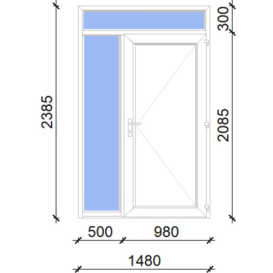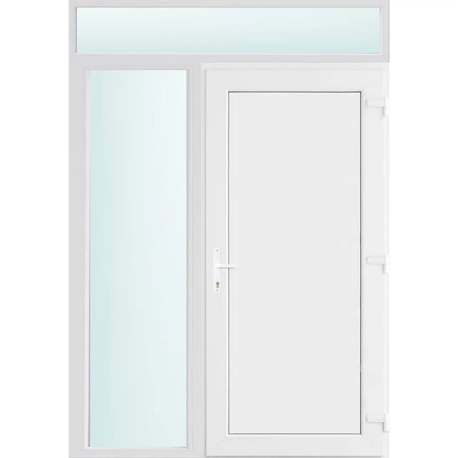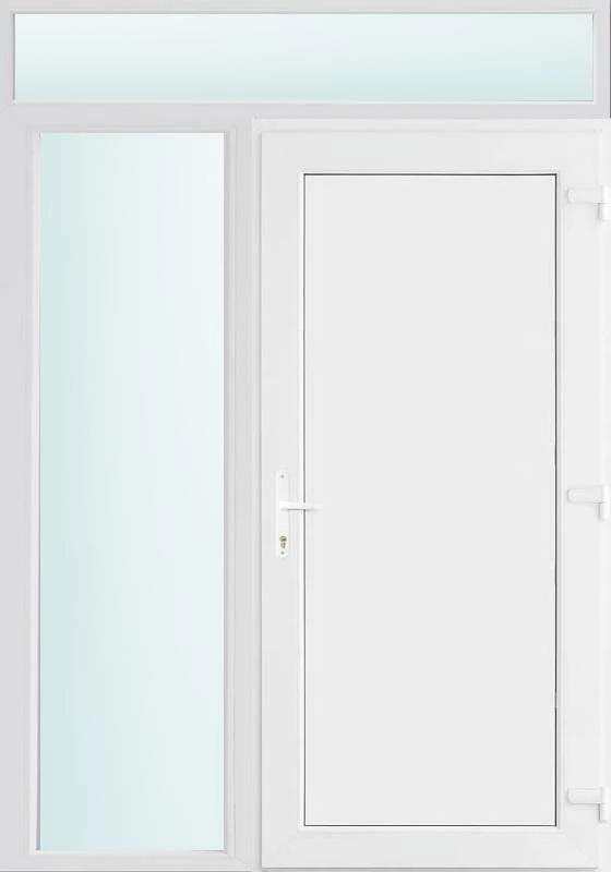 Kiváló hőszigetelésű műanyag bejárati ajtó 5 kamrás profilból, 70 mm beépítési mélységgel, tokban körbefutó idomacél merevítéssel. Vasalat: kilincsműködtetésű, VORNE 5 pontos ajtózárral, 3 db 3D erősített ajtópánttal, 20mm magas hőhídmentes alumínium küszöbbel. Dupla szürke ütközőtömítéssel rendelkezik. Üvegezése "SAVMART" katedrál 2 rétegű Szuperlágybevonatos thermo üveg, 24 mm vastagságban, UG értéke: 1.0 W/m2K . A bejárati ajtó mindkét oldalán fehér színű. Nyitásmódja befelé nyíló, nyitásiránya jobbos ( bentről nézve a zsanér a jobb oldalon helyezkedik el ). Tényleges tokkülmérete: 148 cm széles 238 cm magas. 98 cm széles 208 cm magas bejárati ajtóból,50 cm széles 208 cm magas fix "SAVMART" üvegezésű ( nem nyitható) oldalvilágítóból és egy 148 cm széles 30 cm magas fix "SAVMART" üvegezésű ( nem nyitható) felülvilágítóból áll. ( három külön elem ami beépítéskor összeszerelendő). A nyílászáró ára nem tartalmazza a KILINCSET és a ZÁRBETÉTET a beszereléshez szükséges segédanyagokat (falkampó, csavar, pur-hab..stb.), külső-belső takaróléceket.
