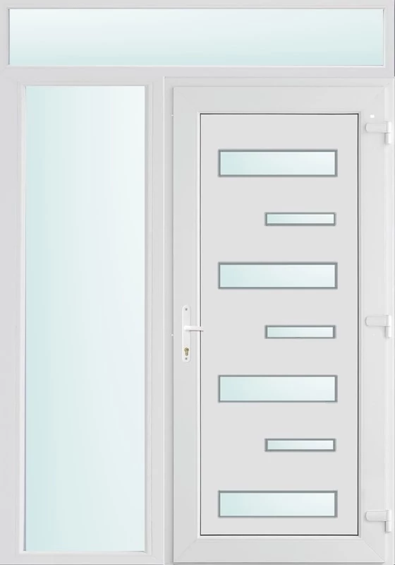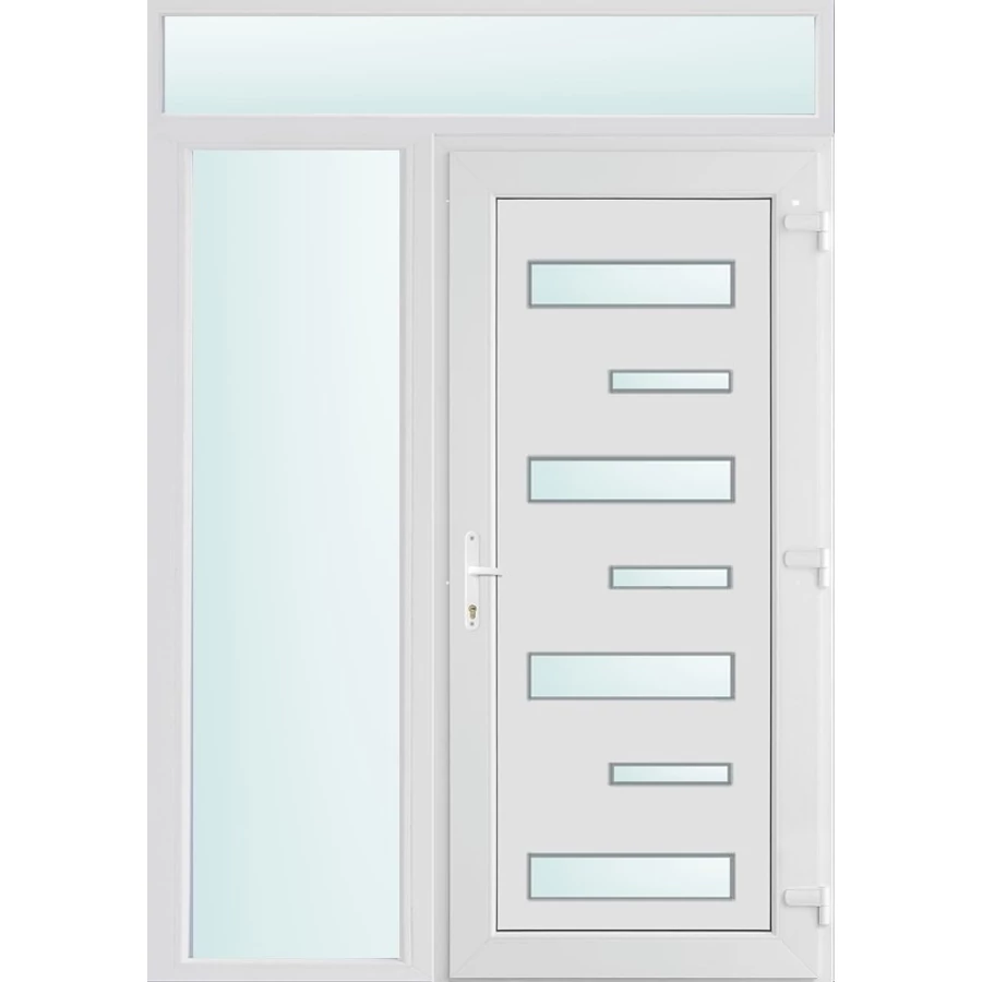 Kiváló hőszigetelésű műanyag bejárati ajtó 5 kamrás profilból, 70 mm beépítési mélységgel, tokban körbefutó idomacél merevítéssel. Vasalat: kilincsműködtetésű, VORNE 5 pontos ajtózárral, 3 db 3D erősített ajtópánttal, 20mm magas hőhídmentes alumínium küszöbbel. Dupla szürke ütközőtömítéssel rendelkezik. Üvegezése "SAVMART" katedrál 2 rétegű Szuperlágybevonatos thermo üveg, 24 mm vastagságban, UG értéke: 1.0 W/m2K . A bejárati ajtó mindkét oldalán fehér színű. Nyitásmódja befelé nyíló, nyitásiránya jobbos ( bentről nézve a zsanér a jobb oldalon helyezkedik el ). Tényleges tokkülmérete: 148 cm széles 238 cm magas. 98 cm széles 208 cm magas bejárati ajtóból,50 cm széles 208 cm magas fix "SAVMART" üvegezésű ( nem nyitható) oldalvilágítóból és egy 148 cm széles 30 cm magas fix "SAVMART" üvegezésű ( nem nyitható) felülvilágítóból áll. ( három külön elem ami beépítéskor összeszerelendő). A nyílászáró ára nem tartalmazza a KILINCSET és a ZÁRBETÉTET a beszereléshez szükséges segédanyagokat (falkampó, csavar, pur-hab..stb.), külső-belső takaróléceket.