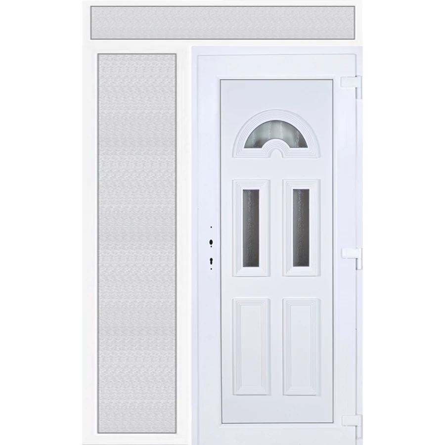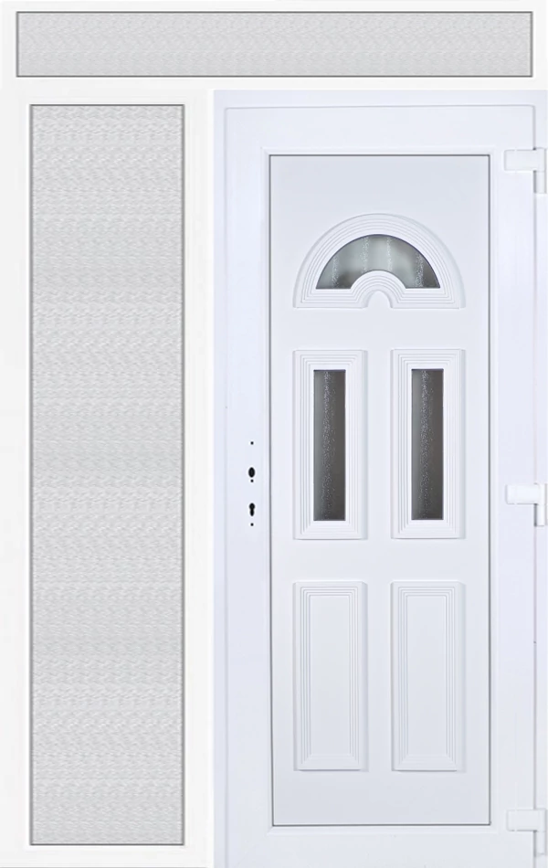 EXTRA hőszigetelésű műanyag bejárati ajtó 5 kamrás profilból, 70 mm beépítési mélységgel, tokban körbefutó idomacél merevítéssel. Vasalat: kilincsműködtetésű, 5 pontos ajtózárral, 3 db 3D erősített ajtópánttal, 20mm magas hőhídmentes alumínium küszöbbel, + 20mm purenittel a küszöb alatt. Dupla szürke ütközőtömítéssel rendelkezik. Üvegezése "savmart" katedrál 3 RÉTEGŰ Szuperlágybevonatos thermo üveg, 42 mm vastagságban, UG értéke: 0,7 W/m2K . A bejárati ajtó mindkét oldalán fehér színű. Nyitásmódja befelé nyíló, nyitásiránya jobbos ( bentről nézve a zsanér a jobb oldalon helyezkedik el ). Tényleges tokkülmérete: 148 cm széles 239 cm magas. 98 cm széles 209 cm magas bejárati ajtóból, 50 cm széles 209 cm magas fix "savmart" üvegezésű ( nem nyitható) oldalvilágítóból és egy 148 cm széles 30 cm magas fix "savmart" üvegezésű ( nem nyitható) felülvilágítóból áll. ( három külön elem ami beépítéskor összeszerelendő). A nyílászáró ára nem tartalmazza a KILINCSET és a ZÁRBETÉTET a beszereléshez szükséges segédanyagokat (falkampó, csavar, pur-hab..stb.), külső-belső takaróléceket.