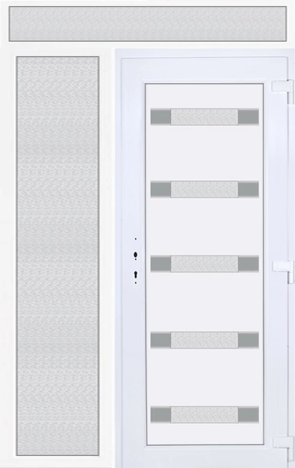 Kiváló hőszigetelésű műanyag bejárati ajtó 5 kamrás profilból, 70 mm beépítési mélységgel, tokban körbefutó idomacél merevítéssel. Vasalat: kilincsműködtetésű, 5 pontos ajtózárral, 3 db 3D erősített ajtópánttal, 35mm magas hőhídmentes alumínium küszöbbel. Dupla szürke ütközőtömítéssel rendelkezik. Üvegezése "GRÍZ" katedrál 2 rétegű Szuperlágybevonatos thermo üveg, 24 mm vastagságban, UG értéke: 1.0 W/m2K . A bejárati ajtó mindkét oldalán fehér színű. Nyitásmódja befelé nyíló, nyitásiránya jobbos ( bentről nézve a zsanér a jobb oldalon helyezkedik el ). Tényleges tokkülmérete: 148 cm széles 238,5 cm magas. 98 cm széles 208,5 cm magas bejárati ajtóból,50 cm széles 208,5 cm magas fix "GRÍZ" üvegezésű ( nem nyitható) oldalvilágítóból és egy 148 cm széles 30 cm magas fix "GRÍZ" üvegezésű ( nem nyitható) felülvilágítóból áll. ( három külön elem ami beépítéskor összeszerelendő). A nyílászáró ára nem tartalmazza a KILINCSET és a ZÁRBETÉTET a beszereléshez szükséges segédanyagokat (falkampó, csavar, pur-hab..stb.), külső-belső takaróléceket.
