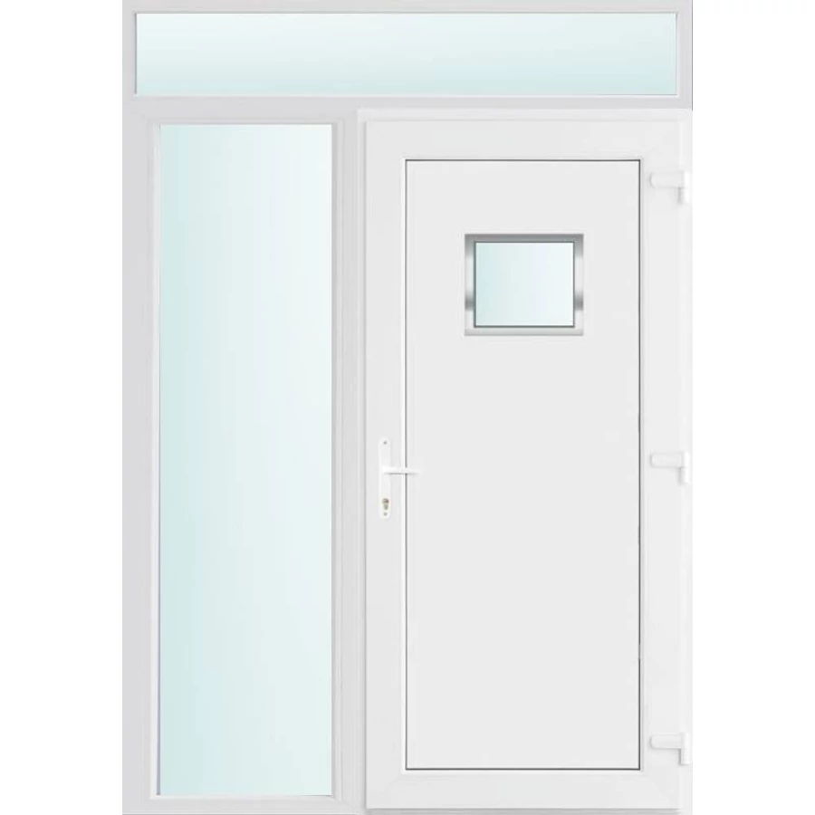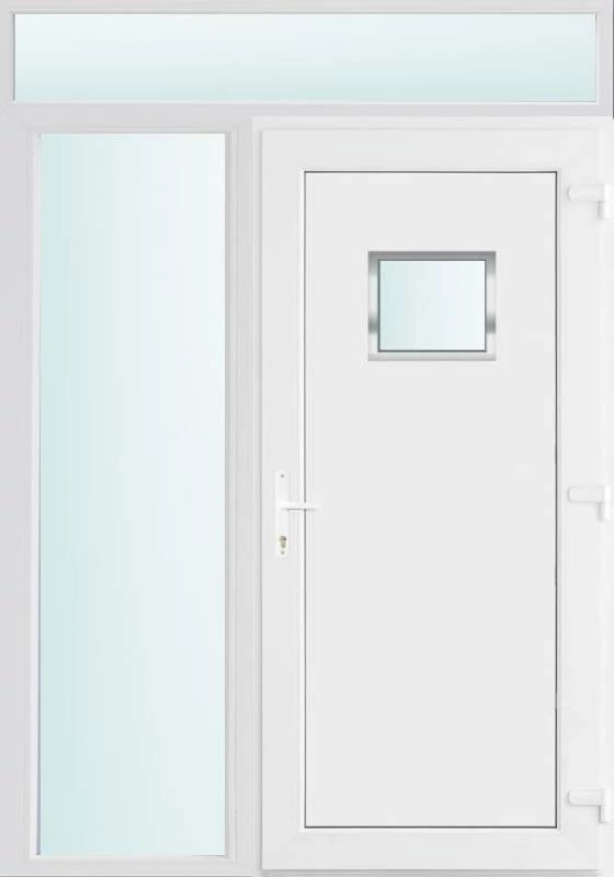 Kiváló hőszigetelésű műanyag bejárati ajtó 5 kamrás profilból, 70 mm beépítési mélységgel, tokban körbefutó idomacél merevítéssel. Vasalat: kilincsműködtetésű, VORNE 5 pontos ajtózárral, 3 db 3D erősített ajtópánttal, 20mm magas hőhídmentes alumínium küszöbbel. Dupla szürke ütközőtömítéssel rendelkezik. Üvegezése "SAVMART" katedrál 2 rétegű Szuperlágybevonatos thermo üveg, 24 mm vastagságban, UG értéke: 1.0 W/m2K . A bejárati ajtó mindkét oldalán fehér színű. Nyitásmódja befelé nyíló, nyitásiránya jobbos ( bentről nézve a zsanér a jobb oldalon helyezkedik el ). Tényleges tokkülmérete: 148 cm széles 238 cm magas. 98 cm széles 208 cm magas bejárati ajtóból,50 cm széles 208 cm magas fix "SAVMART" üvegezésű ( nem nyitható) oldalvilágítóból és egy 148 cm széles 30 cm magas fix "SAVMART" üvegezésű ( nem nyitható) felülvilágítóból áll. ( három külön elem ami beépítéskor összeszerelendő). A nyílászáró ára nem tartalmazza a KILINCSET és a ZÁRBETÉTET a beszereléshez szükséges segédanyagokat (falkampó, csavar, pur-hab..stb.), külső-belső takaróléceket.