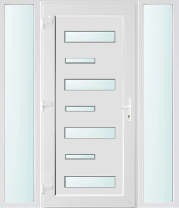 EXTRA hőszigetelésű műanyag bejárati ajtó 5 kamrás profilból, 70 mm beépítési mélységgel, tokban körbefutó idomacél merevítéssel. Vasalat: kilincsműködtetésű, 5 pontos ajtózárral, 3 db 3D erősített ajtópánttal, 20mm magas hőhídmentes alumínium küszöbbel, + 20mm purenittel a küszöb alatt. Dupla szürke ütközőtömítéssel rendelkezik. Üvegezése "savmart" katedrál 3 RÉTEGŰ Szuperlágybevonatos thermo üveg, 42 mm vastagságban, UG értéke: 0,7 W/m2K . A bejárati ajtó mindkét oldalán fehér színű. Nyitásmódja befelé nyíló, nyitásiránya balos ( bentről nézve a zsanér a bal oldalon helyezkedik el ). Tényleges tokkülmérete: 158 cm széles 209 cm magas. 98 cm széles 209 cm magas bejárati ajtóból, és 2 darab 30 cm széles 209 cm magas fix "savmart" üvegezésű ( nem nyitható) oldalvilágítóból áll. ( 3 külön elem ami beépítéskor összeszerelendő). A nyílászáró ára nem tartalmazza a KILINCSET és a ZÁRBETÉTET a beszereléshez szükséges segédanyagokat (falkampó, csavar, pur-hab..stb.), külső-belső takaróléceket.