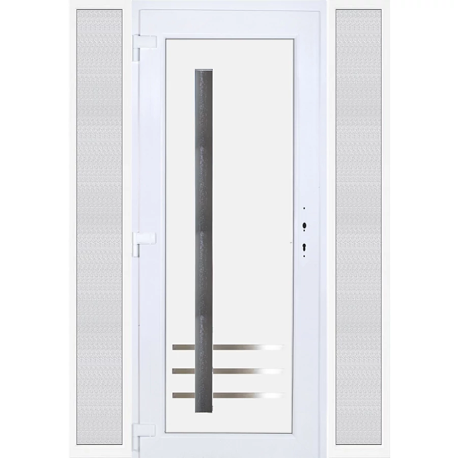 EXTRA hőszigetelésű műanyag bejárati ajtó 5 kamrás profilból, 70 mm beépítési mélységgel, tokban körbefutó idomacél merevítéssel. Vasalat: kilincsműködtetésű, 5 pontos ajtózárral, 3 db 3D erősített ajtópánttal, 20mm magas hőhídmentes alumínium küszöbbel, + 20mm purenittel a küszöb alatt. Dupla szürke ütközőtömítéssel rendelkezik. Üvegezése "savmart" katedrál 3 RÉTEGŰ Szuperlágybevonatos thermo üveg, 42 mm vastagságban, UG értéke: 0,7 W/m2K . A bejárati ajtó mindkét oldalán fehér színű. Nyitásmódja befelé nyíló, nyitásiránya balos ( bentről nézve a zsanér a bal oldalon helyezkedik el ). Tényleges tokkülmérete: 158 cm széles 209 cm magas. 98 cm széles 209 cm magas bejárati ajtóból, és 2 darab 30 cm széles 209 cm magas fix "savmart" üvegezésű ( nem nyitható) oldalvilágítóból áll. ( 3 külön elem ami beépítéskor összeszerelendő). A nyílászáró ára nem tartalmazza a KILINCSET és a ZÁRBETÉTET a beszereléshez szükséges segédanyagokat (falkampó, csavar, pur-hab..stb.), külső-belső takaróléceket.