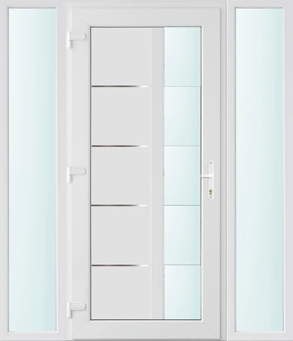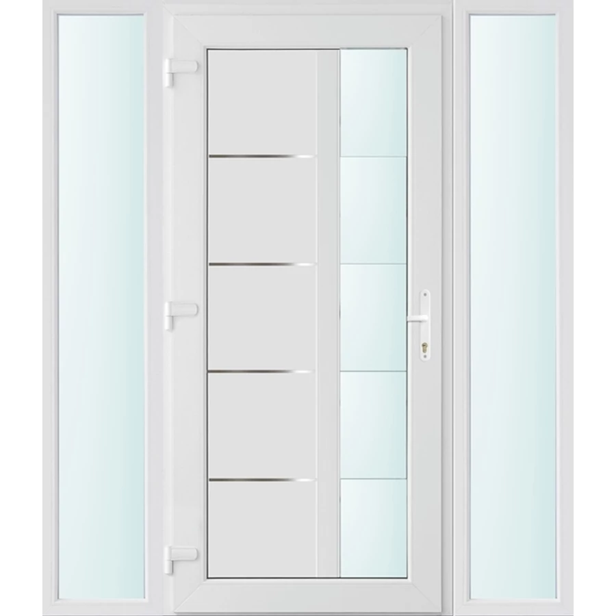 Kiváló hőszigetelésű műanyag bejárati ajtó 5 kamrás profilból, 70 mm beépítési mélységgel, tokban körbefutó idomacél merevítéssel. Vasalat: kilincsműködtetésű, VORNE 5 pontos ajtózárral, 3 db 3D erősített ajtópánttal, 20mm magas hőhídmentes alumínium küszöbbel. Dupla szürke ütközőtömítéssel rendelkezik. Üvegezése "SAVMART" katedrál 2 rétegű Szuperlágybevonatos thermo üveg, 24 mm vastagságban, UG értéke: 1.0 W/m2K . A bejárati ajtó mindkét oldalán fehér színű. Nyitásmódja befelé nyíló, nyitásiránya balos ( bentről nézve a zsanér a bal oldalon helyezkedik el ). Tényleges tokkülmérete: 158 cm széles 208 cm magas. 98 cm széles 208 cm magas bejárati ajtóból, és 2 darab 30 cm széles 208 cm magas fix "SAVMART" üvegezésű ( nem nyitható) oldalvilágítóból áll. ( 3 külön elem ami beépítéskor összeszerelendő). A nyílászáró ára nem tartalmazza a KILINCSET és a ZÁRBETÉTET a beszereléshez szükséges segédanyagokat (falkampó, csavar, pur-hab..stb.), külső-belső takaróléceket.