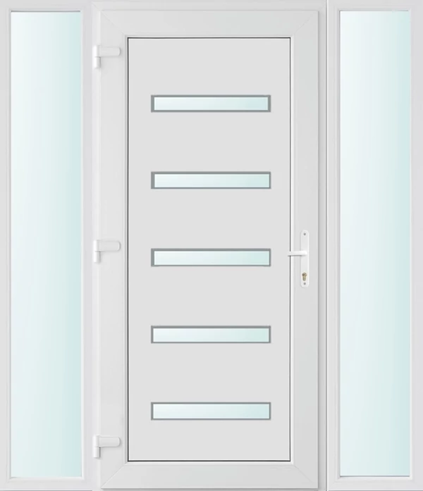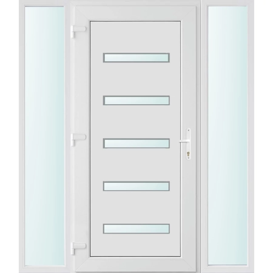 Kiváló hőszigetelésű műanyag bejárati ajtó 5 kamrás profilból, 70 mm beépítési mélységgel, tokban körbefutó idomacél merevítéssel. Vasalat: kilincsműködtetésű, VORNE 5 pontos ajtózárral, 3 db 3D erősített ajtópánttal, 20mm magas hőhídmentes alumínium küszöbbel. Dupla szürke ütközőtömítéssel rendelkezik. Üvegezése "SAVMART" katedrál 2 rétegű Szuperlágybevonatos thermo üveg, 24 mm vastagságban, UG értéke: 1.0 W/m2K . A bejárati ajtó mindkét oldalán fehér színű. Nyitásmódja befelé nyíló, nyitásiránya balos ( bentről nézve a zsanér a bal oldalon helyezkedik el ). Tényleges tokkülmérete: 158 cm széles 208 cm magas. 98 cm széles 208 cm magas bejárati ajtóból, és 2 darab 30 cm széles 208 cm magas fix "SAVMART" üvegezésű ( nem nyitható) oldalvilágítóból áll. ( 3 külön elem ami beépítéskor összeszerelendő). A nyílászáró ára nem tartalmazza a KILINCSET és a ZÁRBETÉTET a beszereléshez szükséges segédanyagokat (falkampó, csavar, pur-hab..stb.), külső-belső takaróléceket.