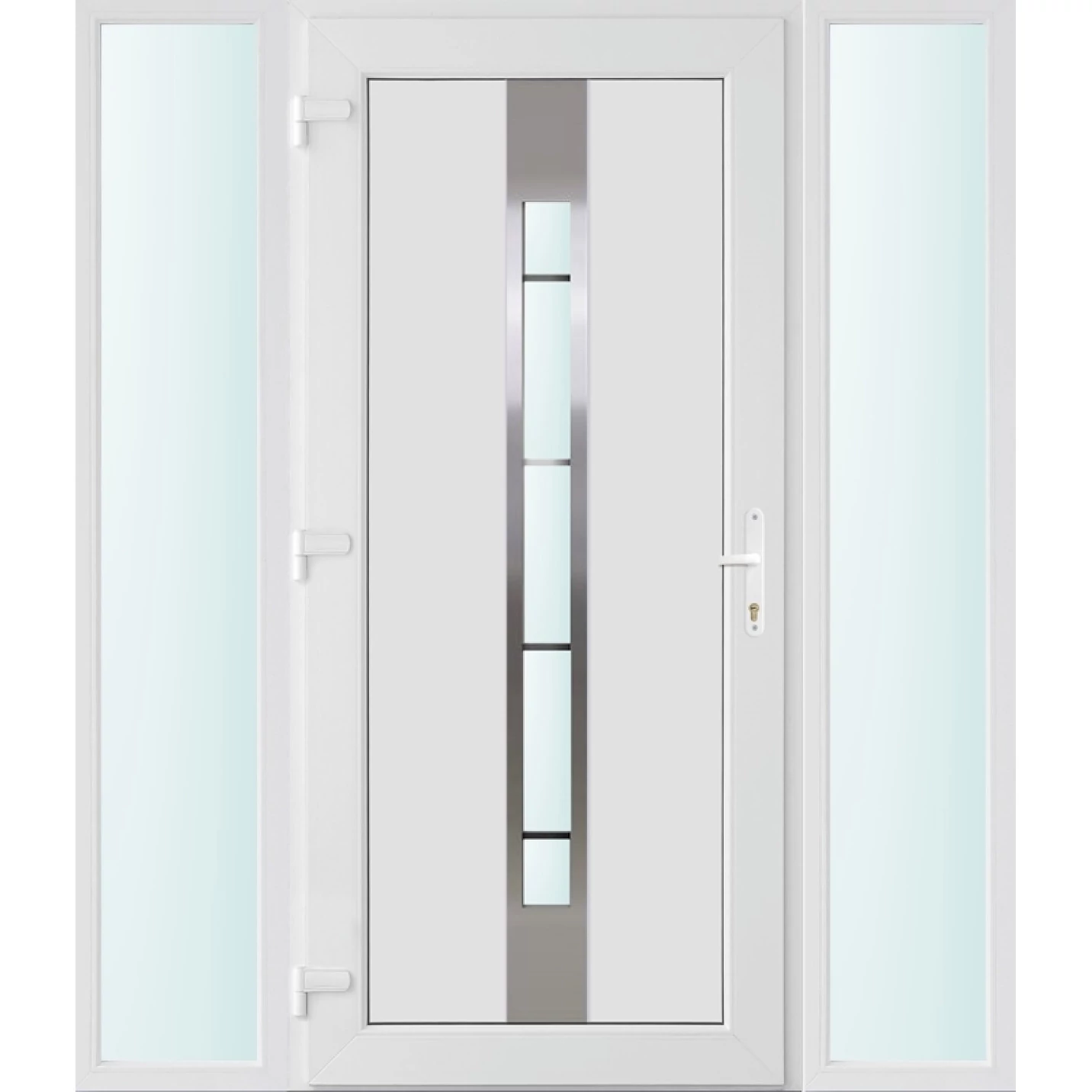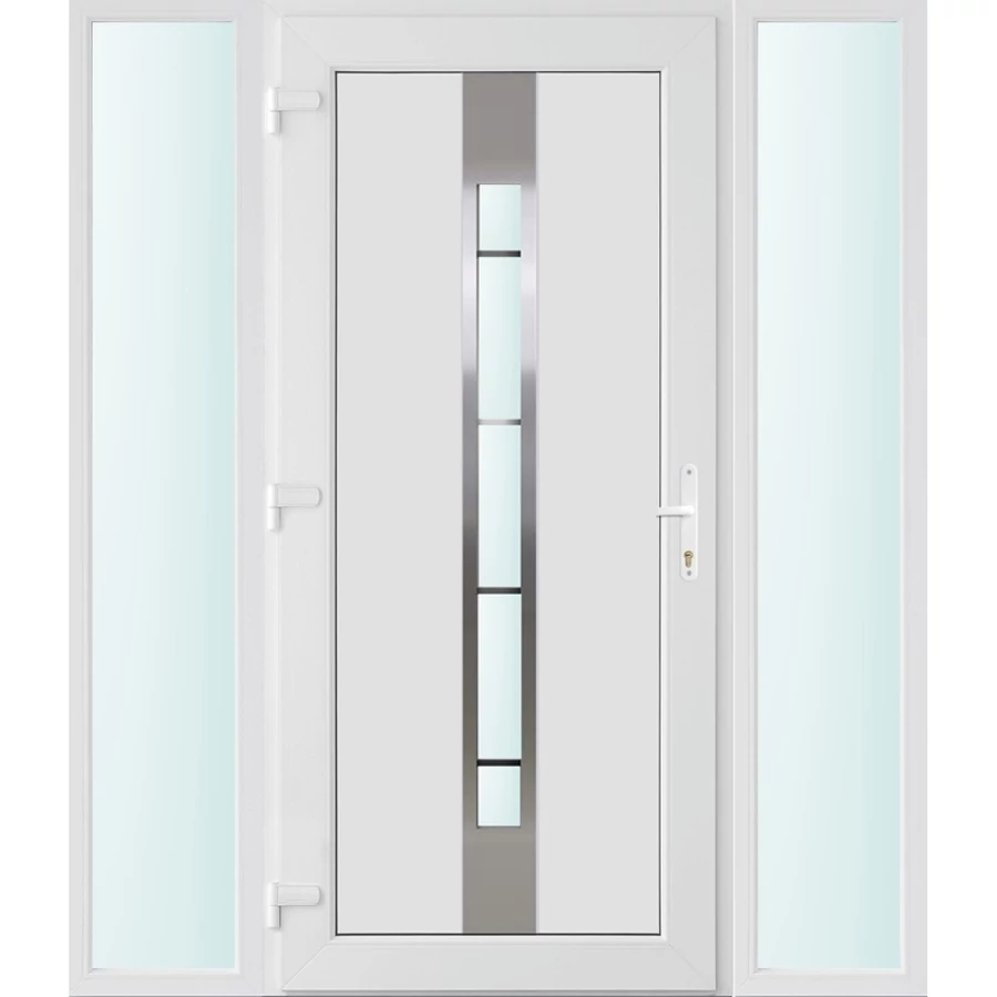 Kiváló hőszigetelésű műanyag bejárati ajtó 5 kamrás Pro line profilból, 70 mm beépítési mélységgel, tokban körbefutó idomacél merevítéssel. Vasalat: kilincsműködtetésű, VORNE 5 pontos ajtózárral, 3 db 3D erősített ajtópánttal, 20mm magas hőhídmentes alumínium küszöbbel. Dupla szürke ütközőtömítéssel rendelkezik. Üvegezése "SAVMART" katedrál 3 rétegű Szuperlágybevonatos thermo üveg, 40 mm vastagságban, UG értéke: 0.7 W/m2K . A bejárati ajtó mindkét oldalán fehér színű. Nyitásmódja befelé nyíló, nyitásiránya balos ( bentről nézve a zsanér a bal oldalon helyezkedik el ). Tényleges tokkülmérete: 158 cm széles 208 cm magas A nyílászáró ára nem tartalmazza a KILINCSET és a ZÁRBETÉTET a beszereléshez szükséges segédanyagokat (falkampó, csavar, pur-hab..stb.), külső-belső takaróléceket.