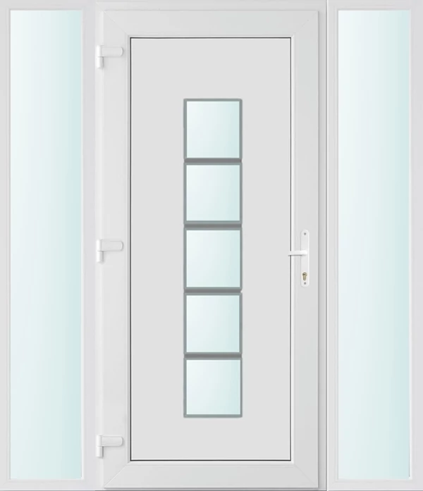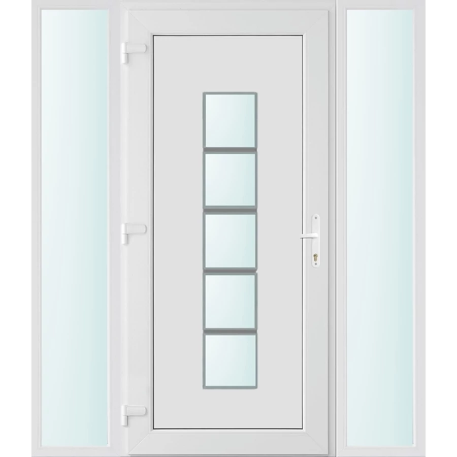 Kiváló hőszigetelésű műanyag bejárati ajtó 5 kamrás profilból, 70 mm beépítési mélységgel, tokban körbefutó idomacél merevítéssel. Vasalat: kilincsműködtetésű, VORNE 5 pontos ajtózárral, 3 db 3D erősített ajtópánttal, 20mm magas hőhídmentes alumínium küszöbbel. Dupla szürke ütközőtömítéssel rendelkezik. Üvegezése "SAVMART" katedrál 2 rétegű Szuperlágybevonatos thermo üveg, 24 mm vastagságban, UG értéke: 1.0 W/m2K . A bejárati ajtó mindkét oldalán fehér színű. Nyitásmódja befelé nyíló, nyitásiránya balos ( bentről nézve a zsanér a bal oldalon helyezkedik el ). Tényleges tokkülmérete: 158 cm széles 208 cm magas. 98 cm széles 208 cm magas bejárati ajtóból, és 2 darab 30 cm széles 208 cm magas fix "SAVMART" üvegezésű ( nem nyitható) oldalvilágítóból áll. ( 3 külön elem ami beépítéskor összeszerelendő). A nyílászáró ára nem tartalmazza a KILINCSET és a ZÁRBETÉTET a beszereléshez szükséges segédanyagokat (falkampó, csavar, pur-hab..stb.), külső-belső takaróléceket.