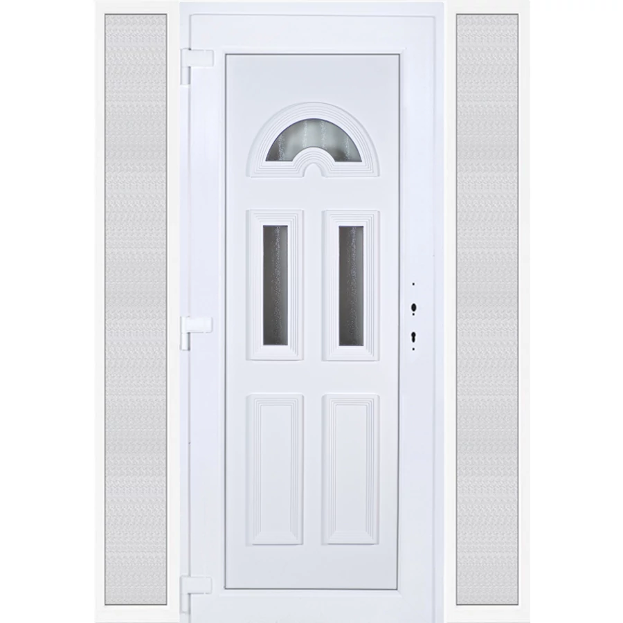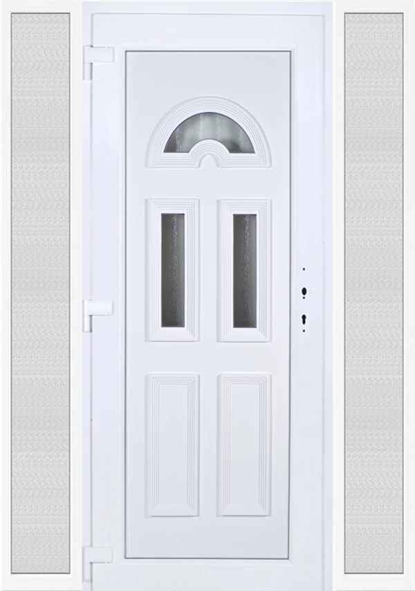Kiváló hőszigetelésű műanyag bejárati ajtó 5 kamrás profilból, 70 mm beépítési mélységgel, tokban körbefutó idomacél merevítéssel. Vasalat: kilincsműködtetésű, 5 pontos ajtózárral, 3 db 3D erősített ajtópánttal, 35mm magas hőhídmentes alumínium küszöbbel. Dupla szürke ütközőtömítéssel rendelkezik. Üvegezése "GRÍZ" katedrál 2 rétegű Szuperlágybevonatos thermo üveg, 24 mm vastagságban, UG értéke: 1.0 W/m2K . A bejárati ajtó mindkét oldalán fehér színű. Nyitásmódja befelé nyíló, nyitásiránya balos ( bentről nézve a zsanér a bal oldalon helyezkedik el ). Tényleges tokkülmérete: 158 cm széles 208,5 cm magas. 98 cm széles 208,5 cm magas bejárati ajtóból, és 2 darab 30 cm széles 208,5 cm magas fix "GRÍZ" üvegezésű ( nem nyitható) oldalvilágítóból áll. ( 3 külön elem ami beépítéskor összeszerelendő). A nyílászáró ára nem tartalmazza a KILINCSET és a ZÁRBETÉTET a beszereléshez szükséges segédanyagokat (falkampó, csavar, pur-hab..stb.), külső-belső takaróléceket.