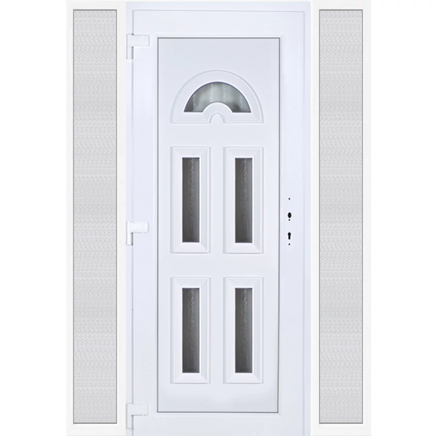 EXTRA hőszigetelésű műanyag bejárati ajtó 5 kamrás profilból, 70 mm beépítési mélységgel, tokban körbefutó idomacél merevítéssel. Vasalat: kilincsműködtetésű, 5 pontos ajtózárral, 3 db 3D erősített ajtópánttal, 20mm magas hőhídmentes alumínium küszöbbel, + 20mm purenittel a küszöb alatt. Dupla szürke ütközőtömítéssel rendelkezik. Üvegezése "savmart" katedrál 3 RÉTEGŰ Szuperlágybevonatos thermo üveg, 42 mm vastagságban, UG értéke: 0,7 W/m2K . A bejárati ajtó mindkét oldalán fehér színű. Nyitásmódja befelé nyíló, nyitásiránya balos ( bentről nézve a zsanér a bal oldalon helyezkedik el ). Tényleges tokkülmérete: 158 cm széles 209 cm magas. 98 cm széles 209 cm magas bejárati ajtóból, és 2 darab 30 cm széles 209 cm magas fix "savmart" üvegezésű ( nem nyitható) oldalvilágítóból áll. ( 3 külön elem ami beépítéskor összeszerelendő). A nyílászáró ára nem tartalmazza a KILINCSET és a ZÁRBETÉTET a beszereléshez szükséges segédanyagokat (falkampó, csavar, pur-hab..stb.), külső-belső takaróléceket.