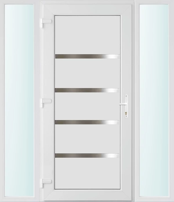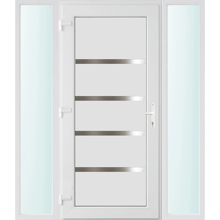 Kiváló hőszigetelésű műanyag bejárati ajtó 5 kamrás Pro line profilból, 70 mm beépítési mélységgel, tokban körbefutó idomacél merevítéssel. Vasalat: kilincsműködtetésű, VORNE 5 pontos ajtózárral, 3 db 3D erősített ajtópánttal, 20mm magas hőhídmentes alumínium küszöbbel. Dupla szürke ütközőtömítéssel rendelkezik. Üvegezése "SAVMART" katedrál 3 rétegű Szuperlágybevonatos thermo üveg, 40 mm vastagságban, UG értéke: 0.7 W/m2K . A bejárati ajtó mindkét oldalán fehér színű. Nyitásmódja befelé nyíló, nyitásiránya balos ( bentről nézve a zsanér a bal oldalon helyezkedik el ). Tényleges tokkülmérete: 158 cm széles 208 cm magas A nyílászáró ára nem tartalmazza a KILINCSET és a ZÁRBETÉTET a beszereléshez szükséges segédanyagokat (falkampó, csavar, pur-hab..stb.), külső-belső takaróléceket.